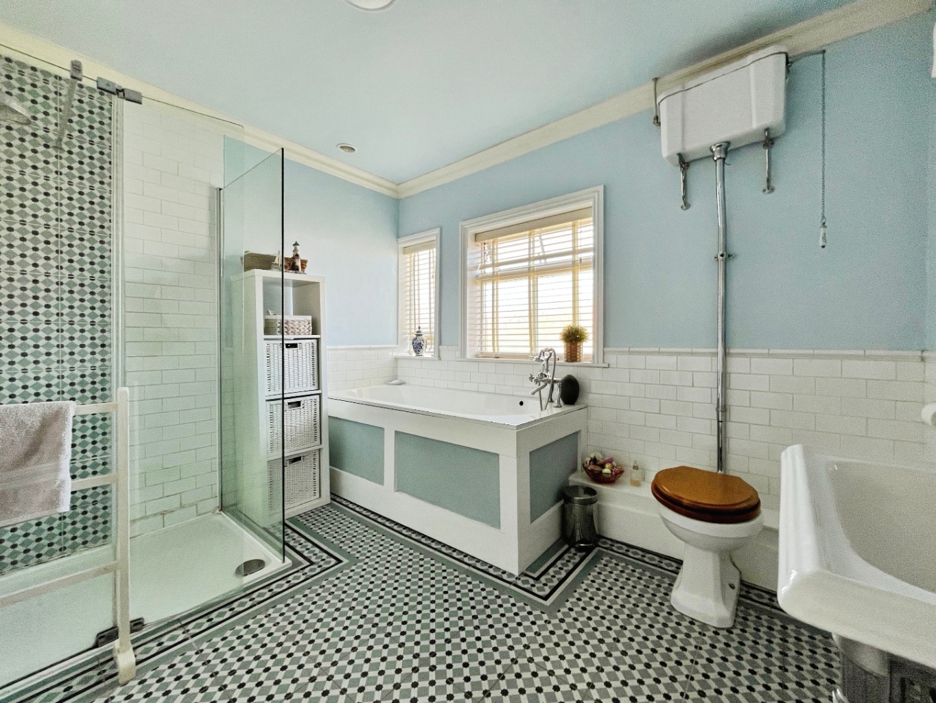 Upstairs, you'll find a GALLERIED LANDING leading to FOUR DOUBLE BEDROOMS, a fifth single bedroom or STUDY, and a lovely house BATHROOM.