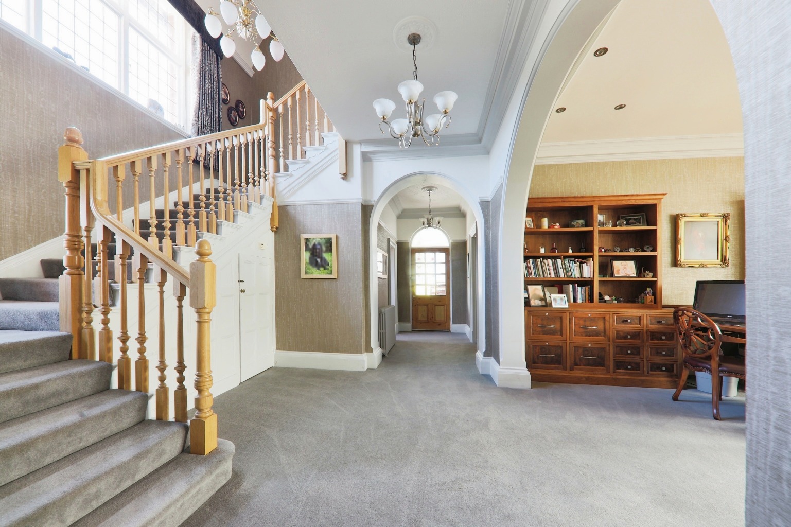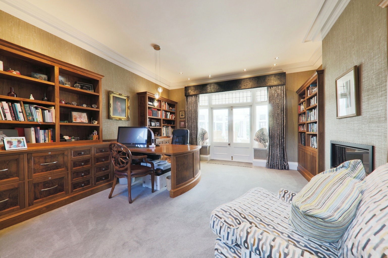 The house spans approximately 7,500 sq. ft., offering ample space for both relaxation and entertainment. The entrance vestibule leads you into an inner hall with a fine staircase that sets the tone for the rest of the home. The open-plan bespoke study is perfect for working from home, while the drawing room, with its south-facing bay window, invites plenty of natural light.