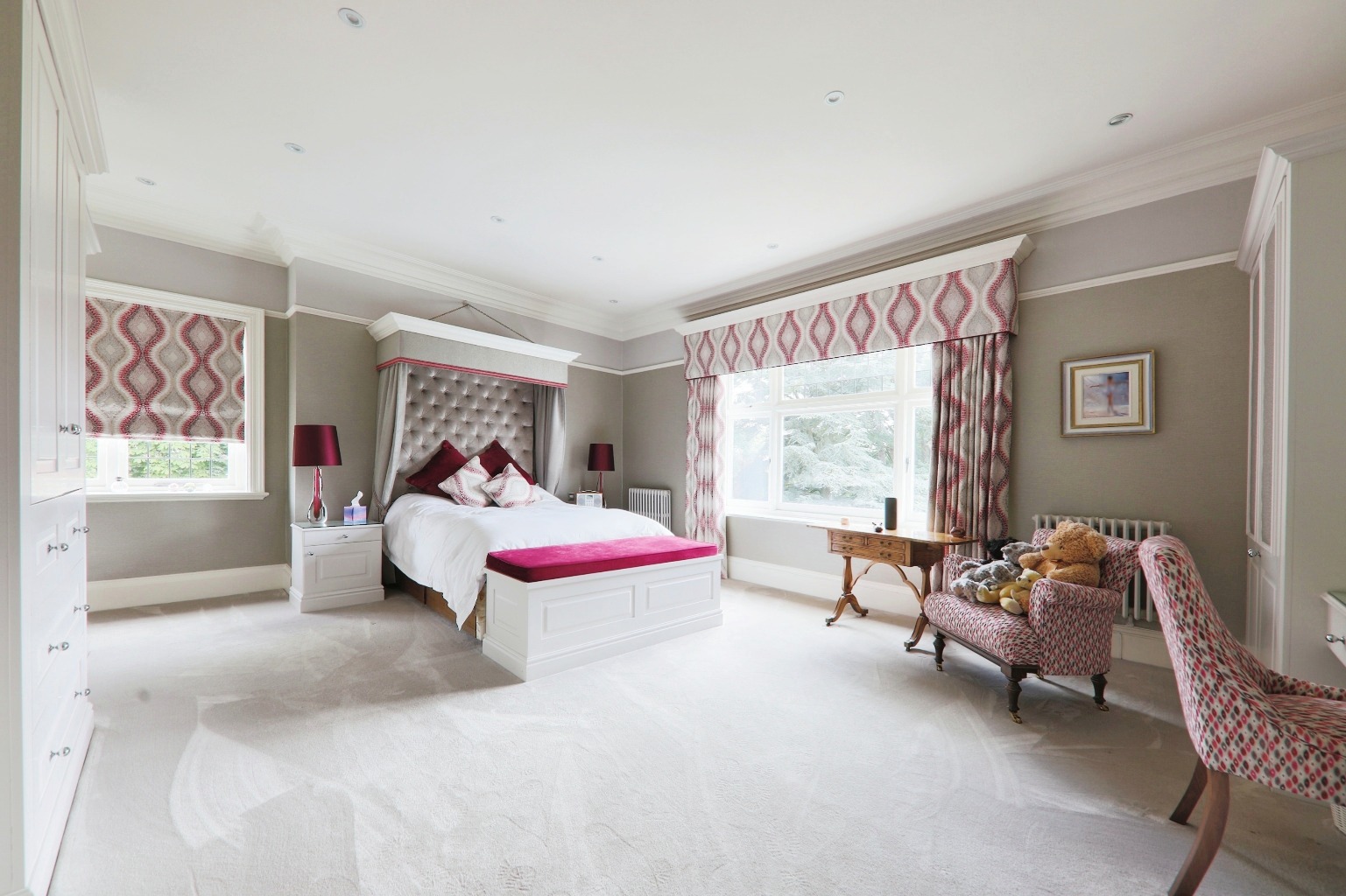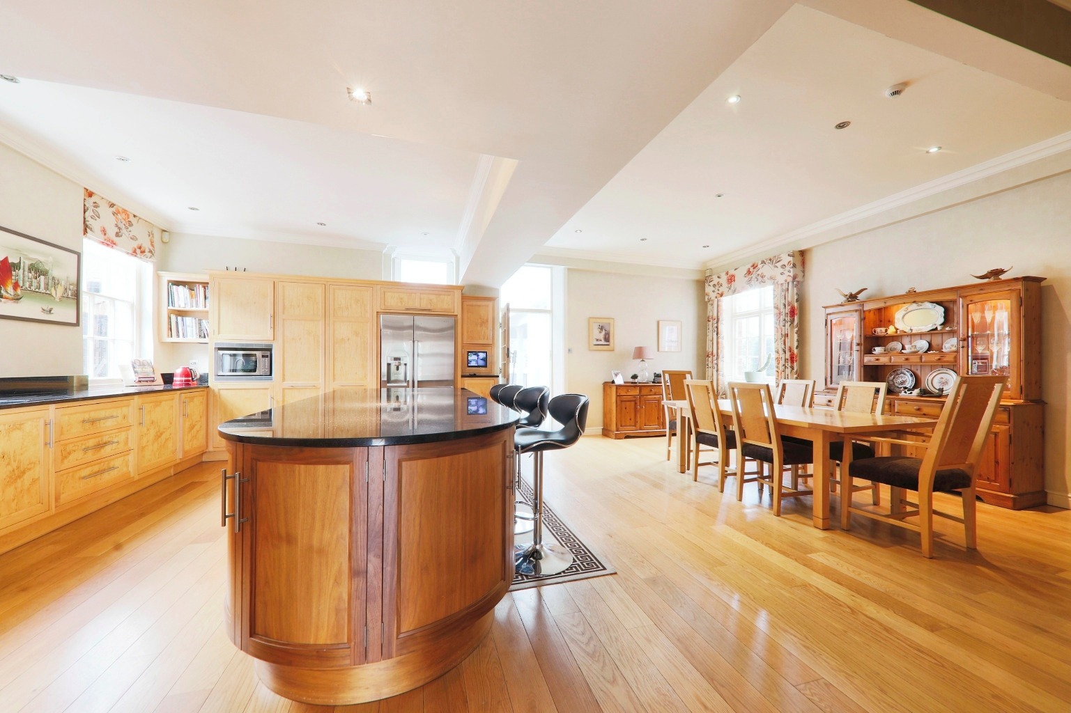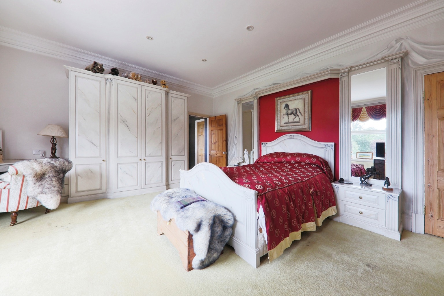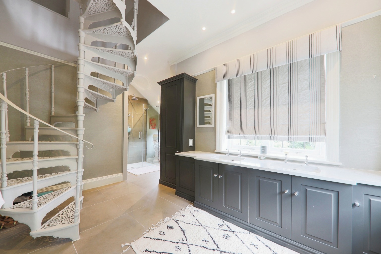 Moving upstairs, the master bedroom suite is impressive, with an ensuite and a spiral staircase leading to a second-floor bathroom. In total, there are seven bedrooms, providing plenty of accommodation for family and guests.