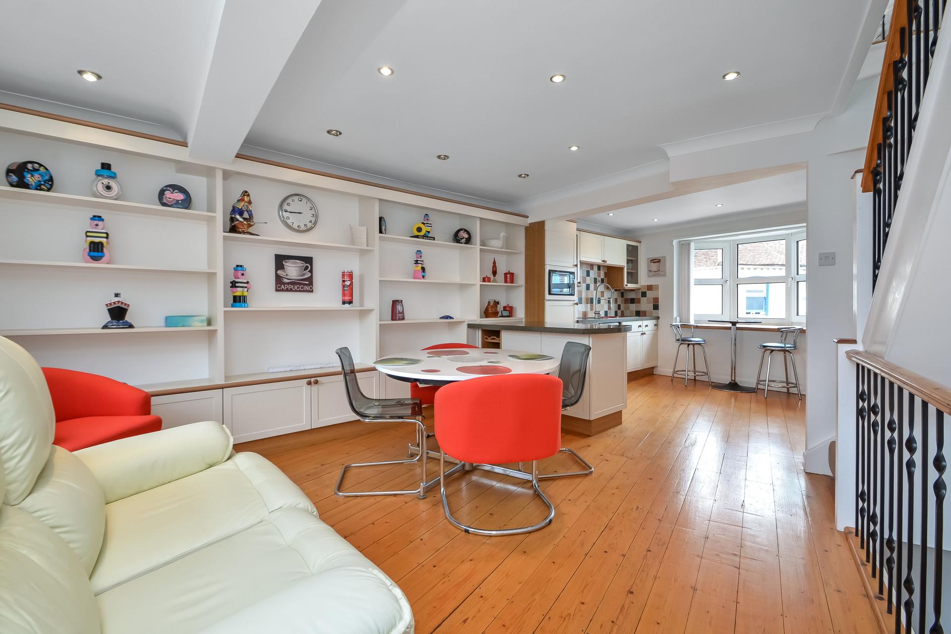 OPEN PLAN KITCHEN / DINING ROOM 23' 11" x 14' 7" (7.29m x 4.44m) Decreasing to 11'1" at narrowest point. Dining area, stripped and stained floorboards, matching balustrade staircase rising to top floor, double glazed window to rear aspect overlooking roof terrace, double radiator, comprehensive range of built-in cupboards/book shelving, ceiling coving and spotlights, twin double glazed doors leading to rear terrace with views over Camber Dock and towards the City of Portsmouth, tall larder built-in storage cupboard housing Worcester boiler supplying domestic hot water and central heating (not tested), peninsular style divide with breakfast bar to one side and wine rack with work surface and cupboards under, leading to;