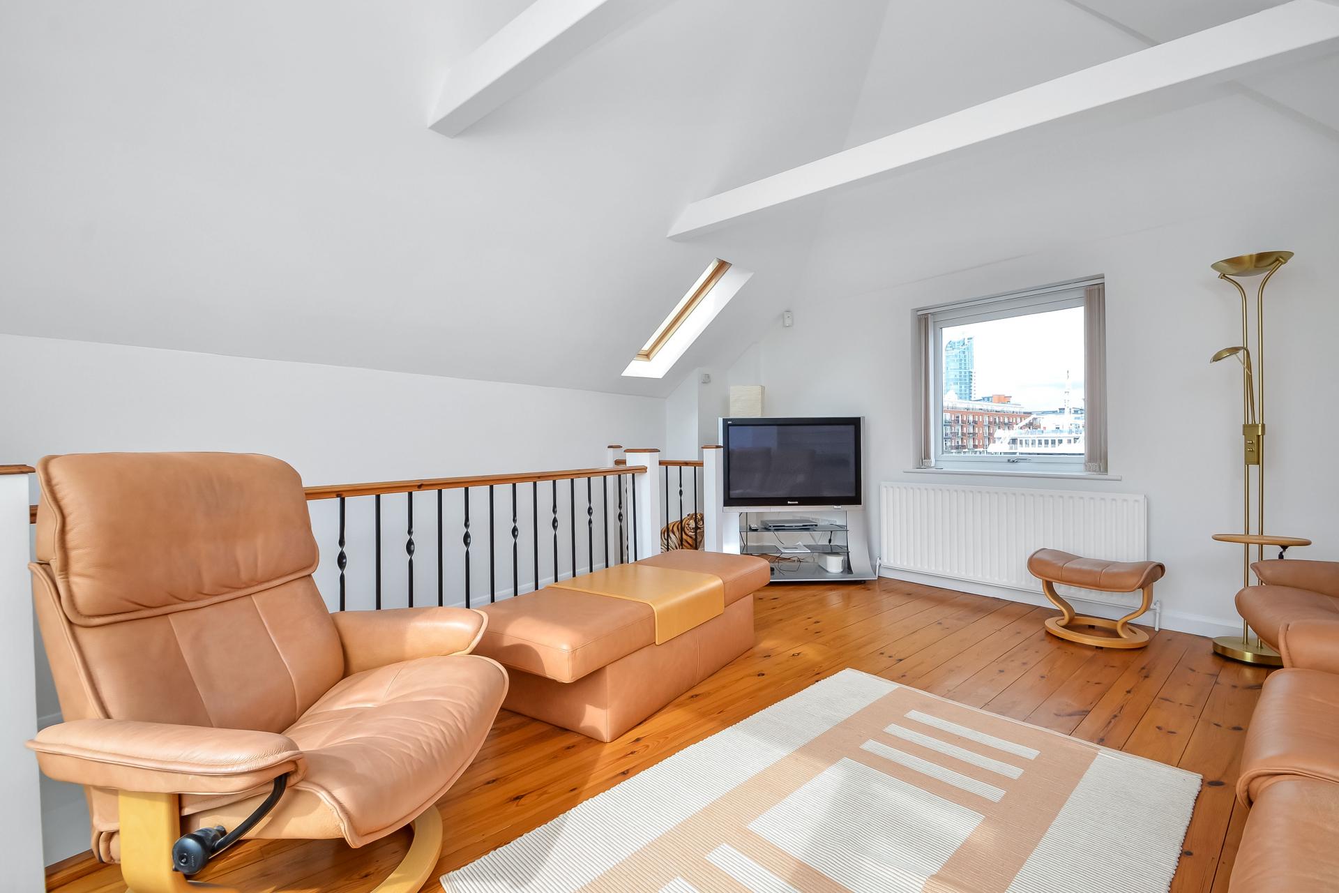 SITTING ROOM 16' 10" maximum x 14' 7" (5.13m x 4.44m) Balustrade with matching spindles, pitched roof with painted supports, skylight window to side aspect with views at an angle towards the Spinnaker Tower, double glazed window to rear aspect overlooking the Camber Dock, towards the No.1 Building and the Ben Ainsley Racing Head Quarters, radiator, power points, range of glazed built-in shelving, feature porthole high level window to front aspect, twin double glazed doors with full height double glazed panels to either side leading to roof terrace, stripped and stained floorboards, power points.