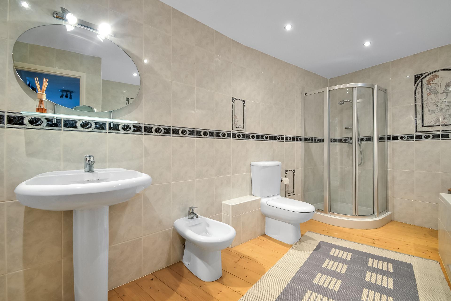 BATHROOM 14' 6" x 8' 7" maximum (4.42m x 2.62m) Fully ceramic tiled to walls, stripped and stained wooden flooring, roll top radiator with chrome towel rail, white suite comprising; double ended panelled bath with wall mounted taps, ceiling spotlights, corner shower cubicle with curved panelled doors, low level w.c., bidet with mixer tap, pedestal wash hand basin with mixer tap, extractor fan, panelled door.