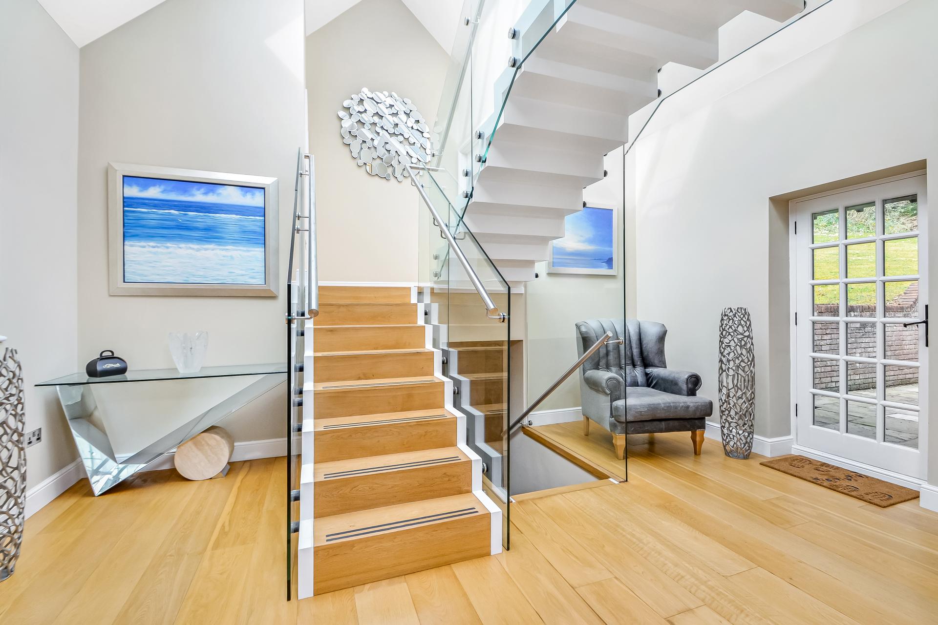 INNER HALLWAY / RECEPTION AREA 16' 3" x 11' 8" (4.95m x 3.56m) Vaulted ceiling with double glazed glass, ceiling spotlights, painted beams, wooden staircase with glazed panels and chrome fenders to either side, double glazed door with window to one side leading to south terrace, wooden flooring, low level lighting, further matching door to other side leading to enclosed north terrace, steps leading down to entertainment room/cinema room, door to one side with curved walls to either side with twin doors leading to kitchen/family room and sitting room, two roll topped radiators, brushed steel fronted power points, dimmer switches and zoned lighting, double glazed windows to front aspect overlooking paddock, fields and woodland opposite, wooden flooring with underfloor heating.