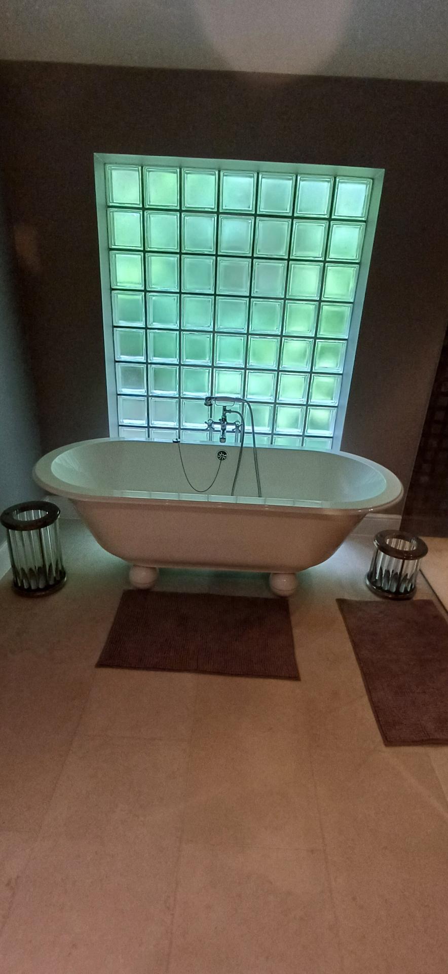 FEATURE EN-SUITE BATHROOM 11' 0" x 7' 3" (3.35m x 2.21m) Double ended claw footed bath with chrome mixer tap and shower attachment, glass block to one wall, recessed shower area with floor drain away, wall mounted controls with drench style hood and separate shower attachment, extractor fan, chrome heated towel rail, low level w.c, dresser style unit with moulded oval wash hand basin with mixer tap and cupboards under, tiled flooring, vaulted ceiling and spotlights.