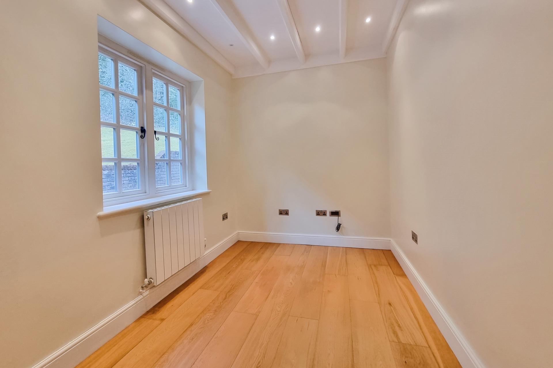 SNUG / STUDY 12' 3" x 7' 1" (3.73m x 2.16m) Matching wooden flooring, double glazed windows with small panes to rear aspect, power points, radiator, painted ceiling beams with speakers and spotlights, control for multi-media system & Cat 5 outlets.