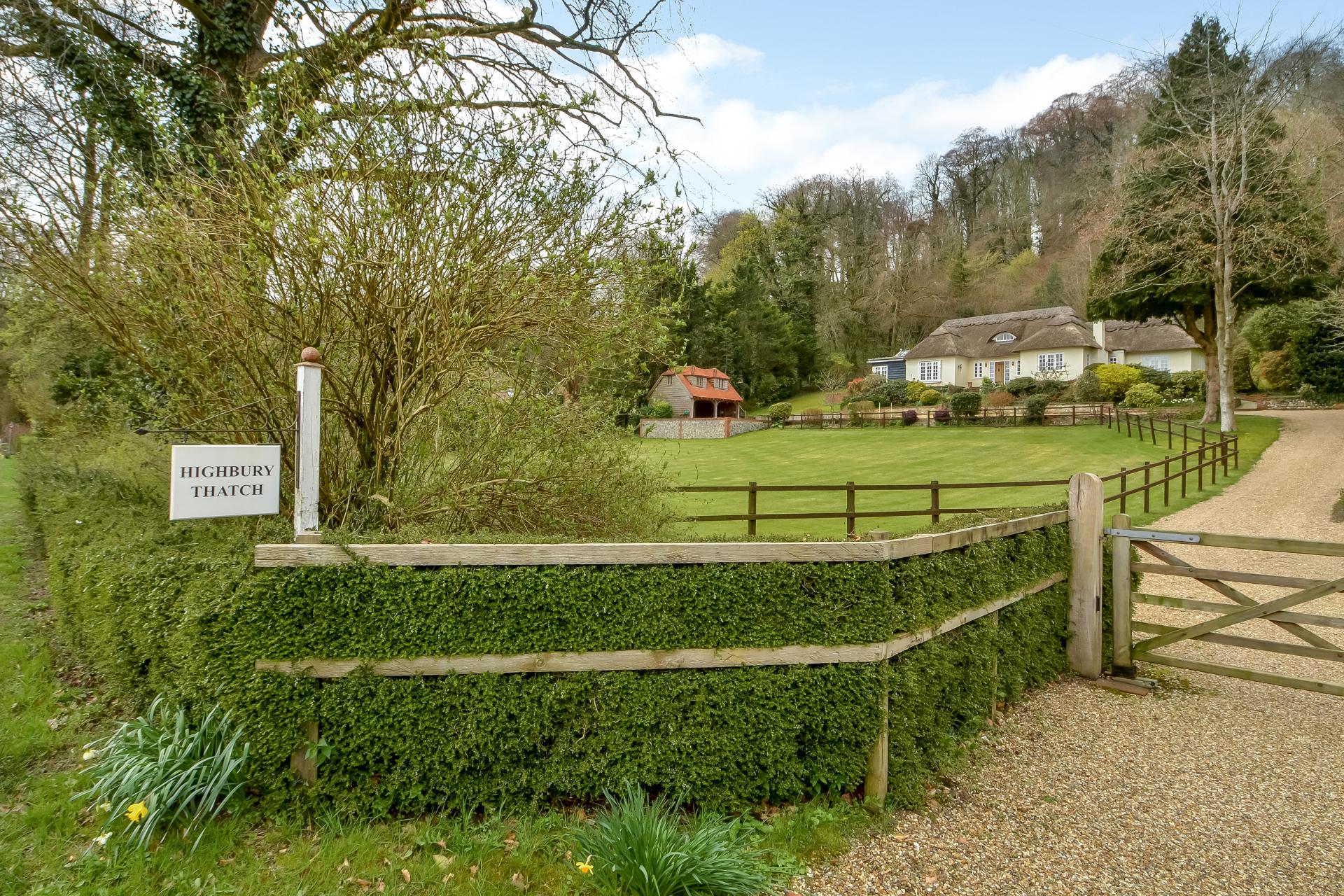 Highbury Thatch is a truly outstanding detached and deceptively large family home which sits proudly back from the road in an elevated position with far reaching views over farmland and woodland opposite. This symmetrical fronted, unique property is set within grounds of approximately 1.7 acres incorporating a paddock, parking and driveway, woodland and established gardens and terraces. The house was extended to incorporate modern living yet retaining original character. The 4162 sq ft of living accommodation is arranged over a variety of split-levels providing interesting and charming individual spaces. On entering the property you are met with an extensive, striking hallway with a central double sided chimney breast, from this initial entrance area are doors leading to the primary rooms, it then opens to the rear with a vaulted, glazed ceiling and a staircase with glass sided staircase rising up to the upper floors.