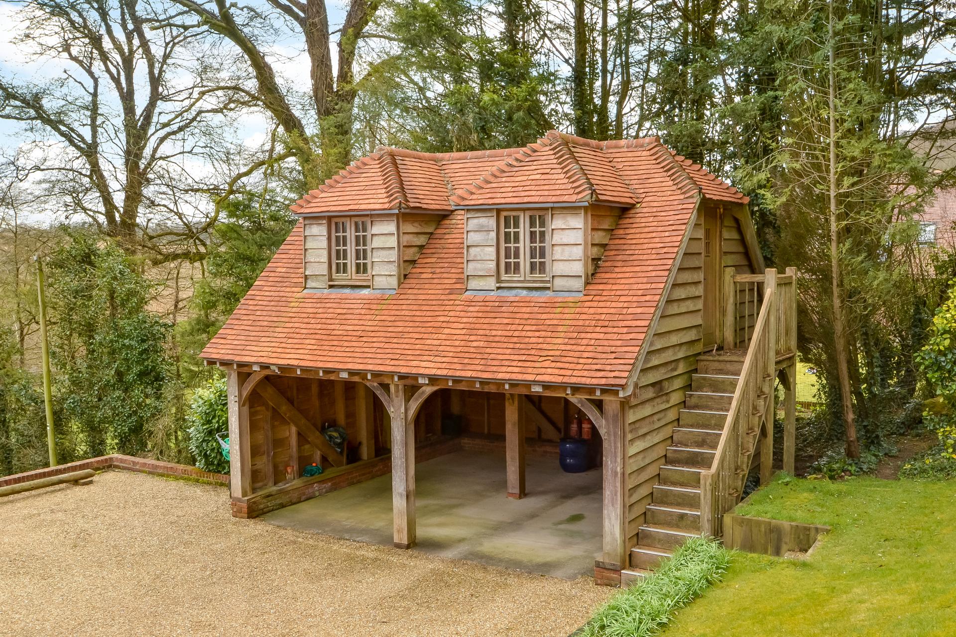OUTSIDE The whole plot extends approximately 1.7 acres with a mixture of established woodland, paddock and formal gardens. To the front of the property is a paddock, enclosed by mature trees and hedges with stable style fence. External light, L shaped driveway with detached garage to the driveway proceeds up to large turning area with brick and flint retaining wall, access to car port and store above, retaining walls with steps leading up to formal garden areas with mature shrubs, evergreens and bushes. Curved retaining brick wall leading to large patio area, accessible from the family/kitchen leading to the rear of the property with external cold water supply and lighting, stepping stone pathway leading to hillside & woodland to the rear, raised area with wooden built store and pond area, further fenced path zig zags up the hill to the top of the plot, from the pathway there are outstanding views for miles over arable fields and woodland opposite.