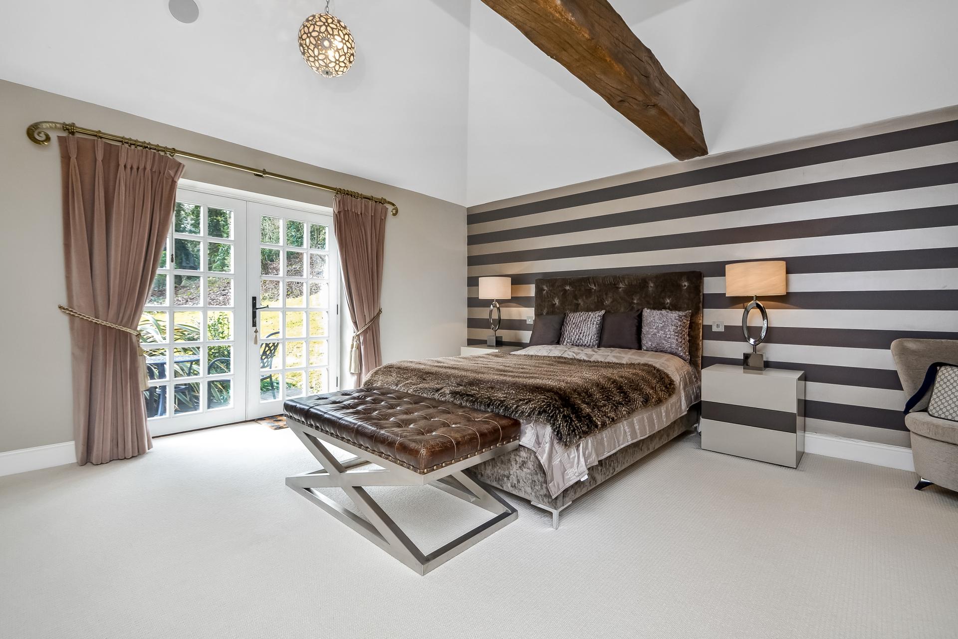 BEDROOM 1 15' 2" x 16' 7" (4.62m x 5.05m) Vaulted ceiling with feature beam, door to en-suite, twin small double glazed framed doors leading to south facing terrace, power points, range of full height built-in wardrobes to one wall with hanging space and shelving incorporating drawer units and wiring for wall mounted T.V., ceiling speakers, power points, door to: