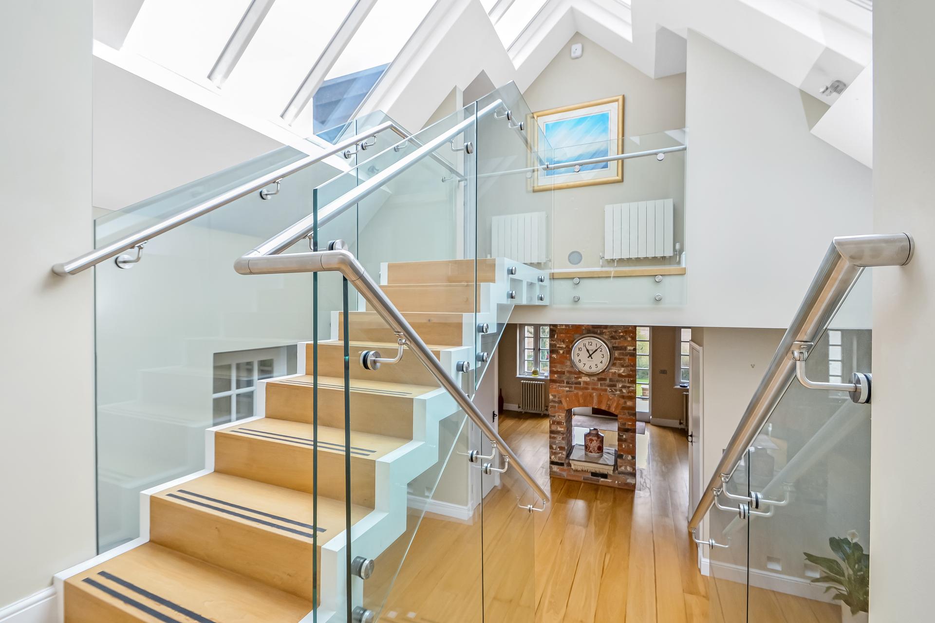 FIRST FLOOR LANDING TO REAR Wooden flooring, high vaulted ceiling with skylight windows, matching staircase with glazed panels and chrome fenders leading to upper level, doors to bedrooms one & two.