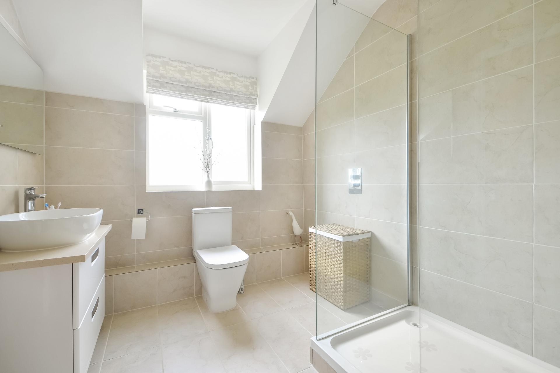 EN-SUITE SHOWER ROOM Large fully ceramic tiled shower cubicle with glazed screens, drench style hood and separate shower attachment, tiled flooring, ceramic tiled to walls, chrome heated towel rail, exposed wooden beam, double glazed frosted dormer window to rear aspect, close coupled w.c., vanity unit with oval wash hand basin, mixer tap and drawers under, mirror with automated lighting, ceiling spotlights, tiled flooring.