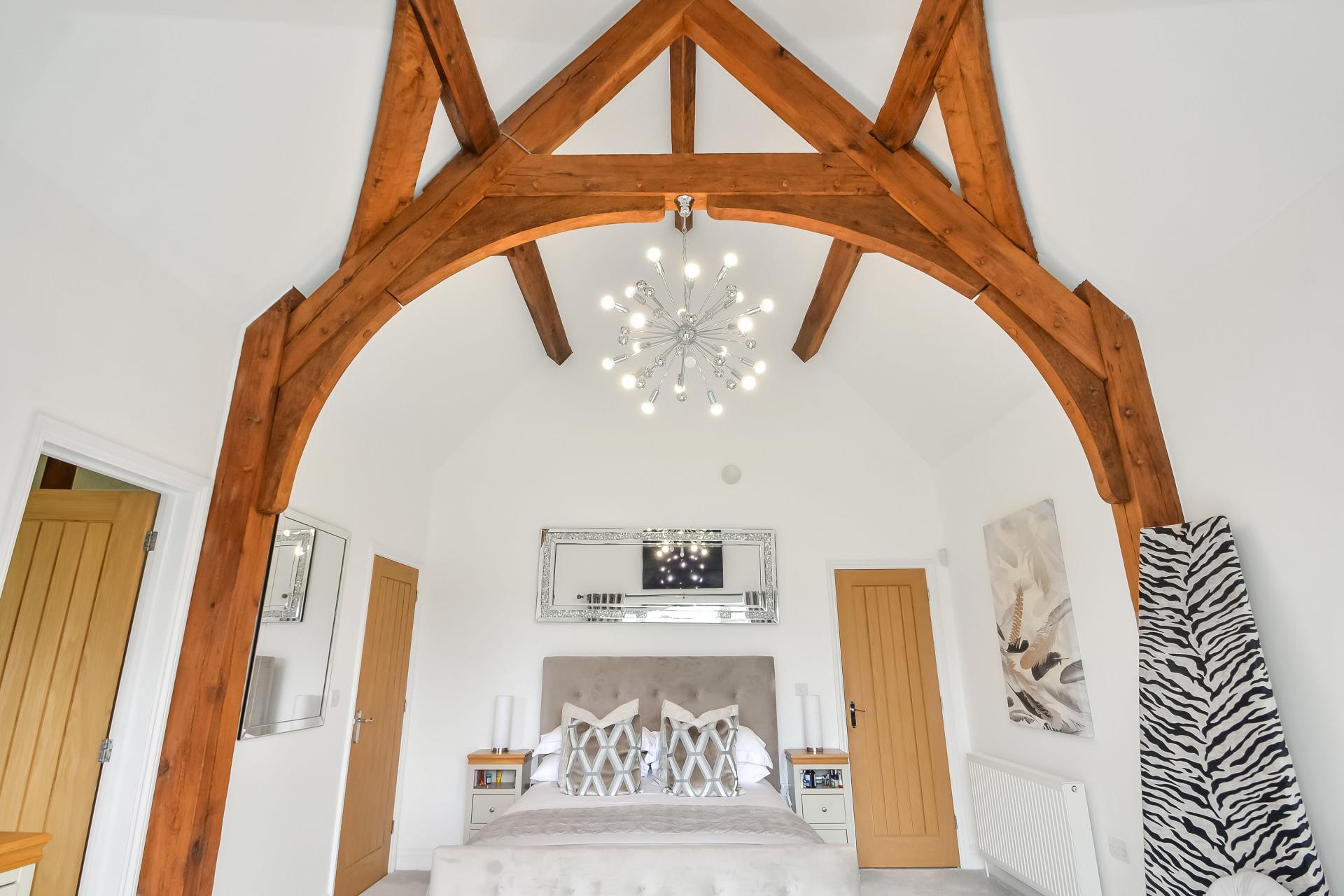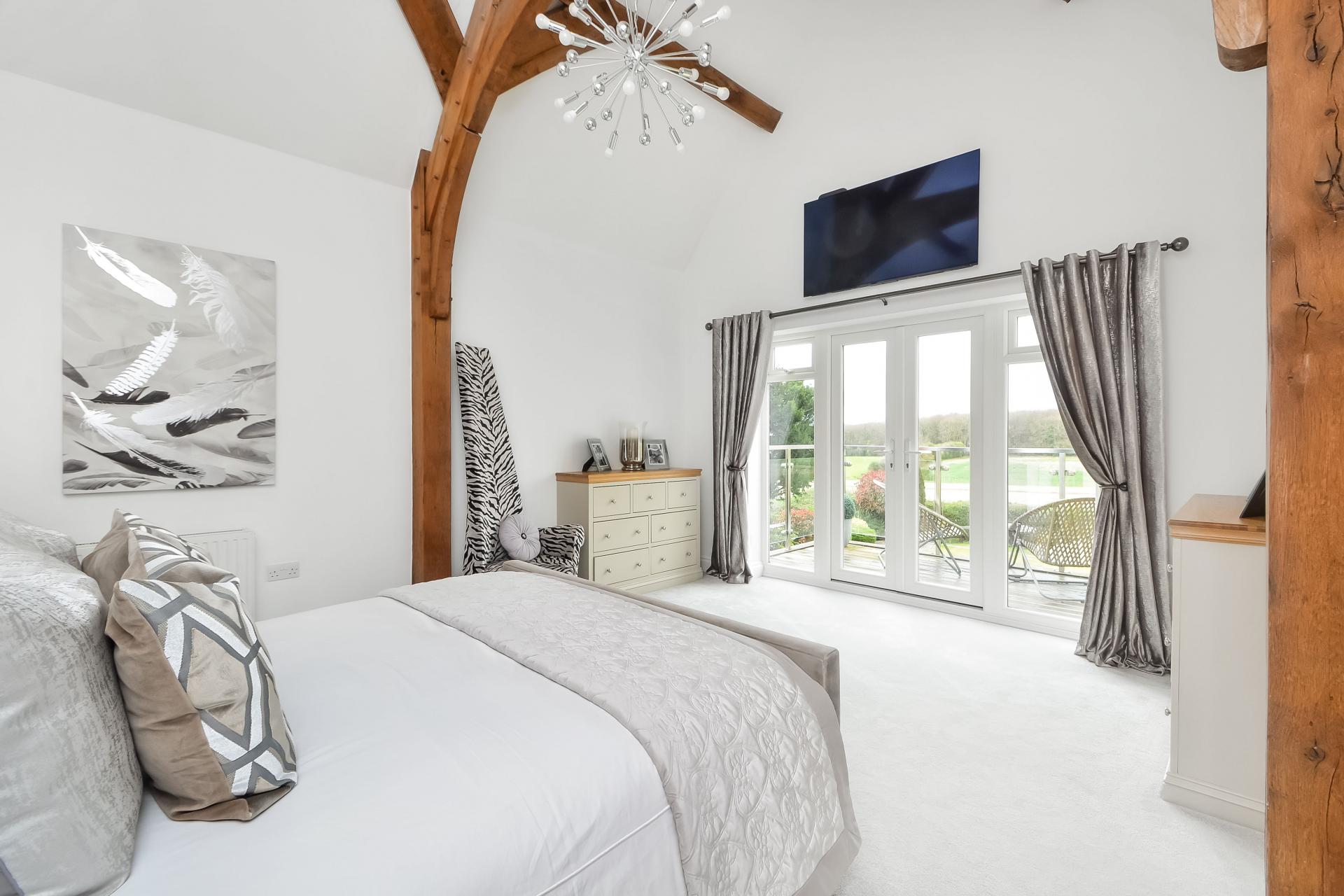 BEDROOM 1 15' 11" x 13' 1" (4.85m x 3.99m) Feature cathedral ceiling measuring approximately 16'8" in height with high pitched roof to either side with exposed beams and wooden arch, two chest of drawers with matching wooden surface over, radiator, double glazed twin doors with full height windows to either side leading to: