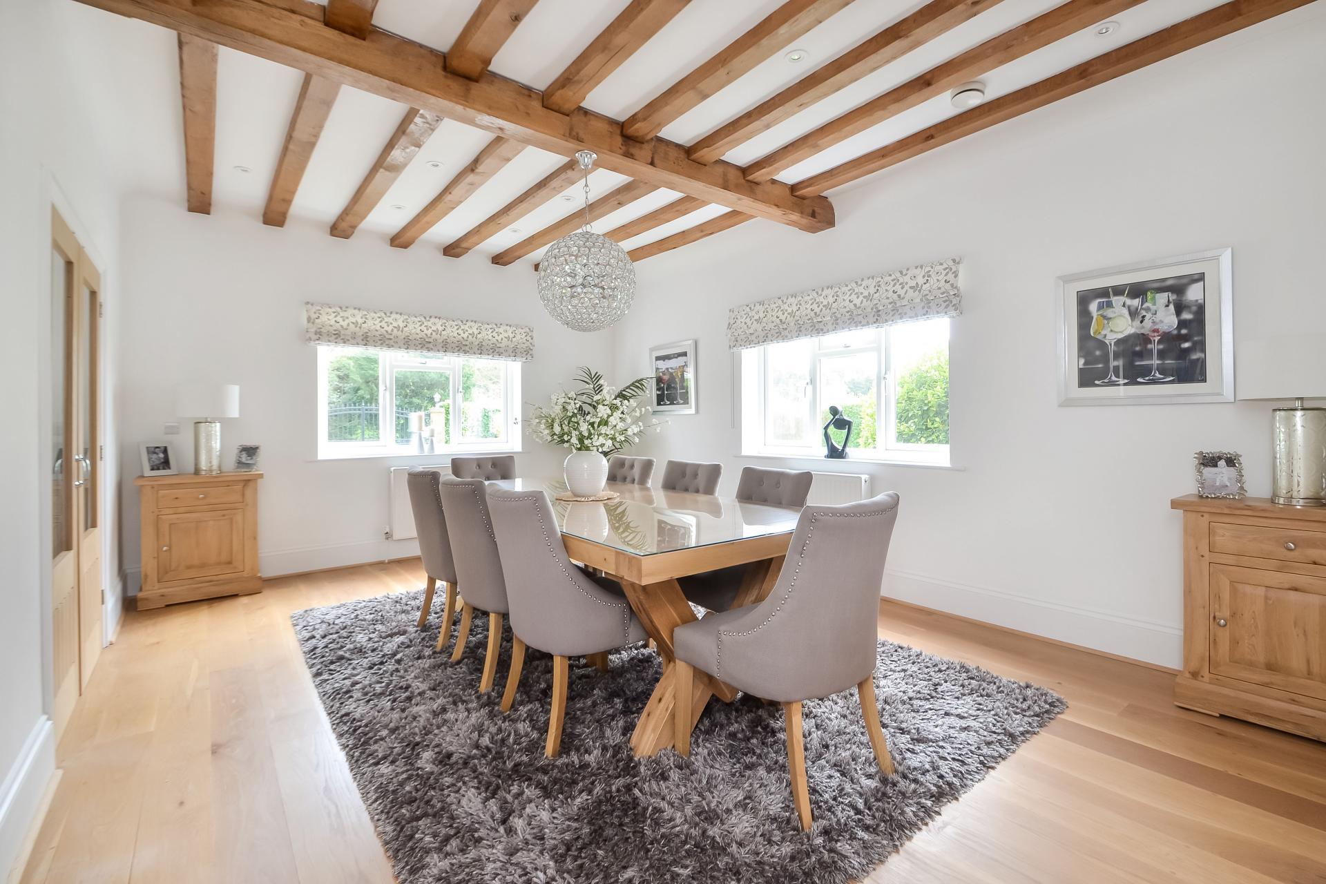 DINING ROOM 18' 4" x 13' 1" (5.59m x 3.99m) Double glazed windows to front aspect overlooking driveway with radiator under, beams to ceiling, spotlights, twin glazed doors leading to hallway, wooden flooring, double glazed window to side aspect with radiator under, twin glazed doors leading to kitchen / breakfast room.