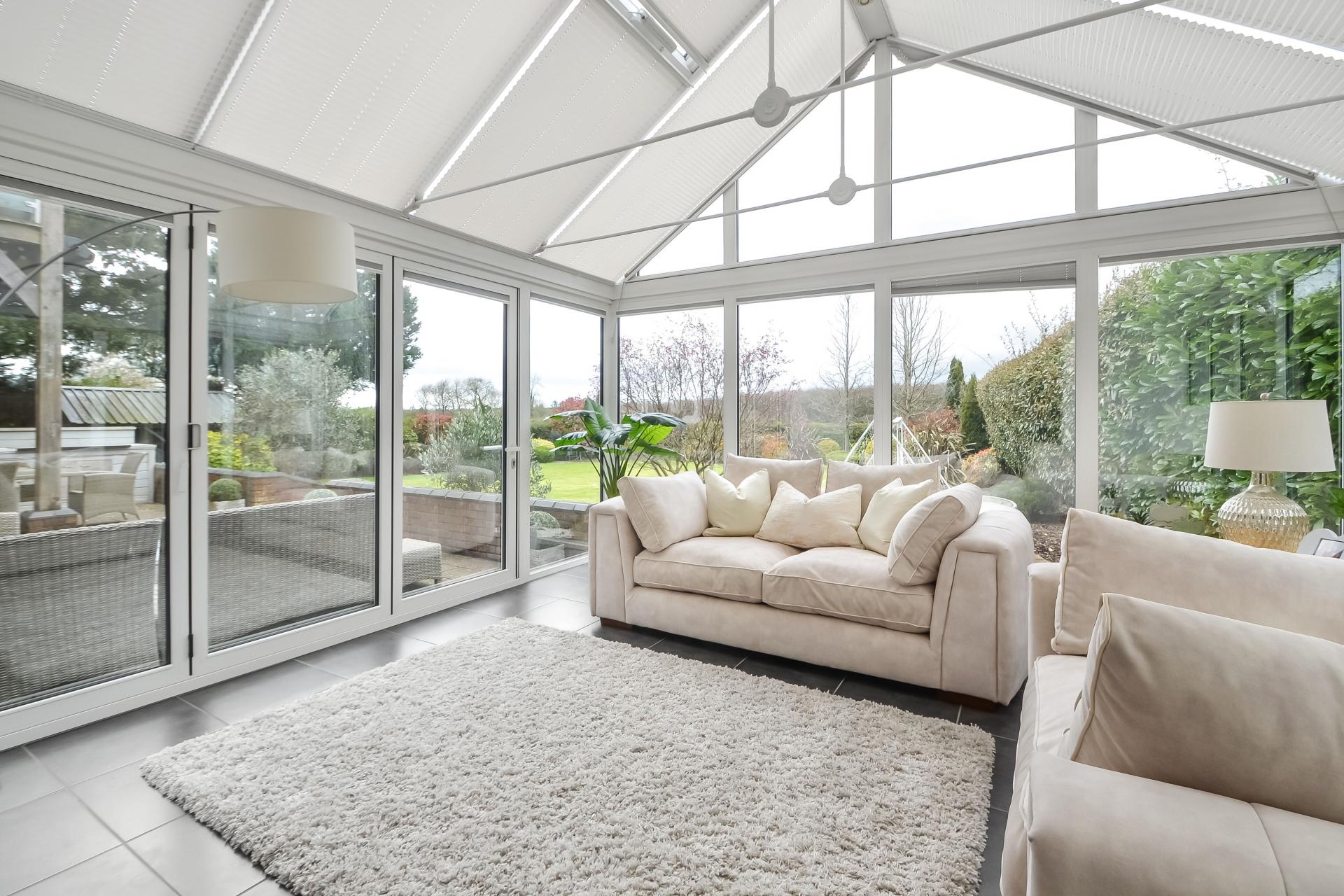 CONSERVATORY 14' 2" x 12' 8" (4.32m x 3.86m) Glass vaulted ceiling with remote controlled openers and spotlights, full height windows with blinds on three sides with bi-folding doors leading to rear garden, tiled flooring with underfloor heating.