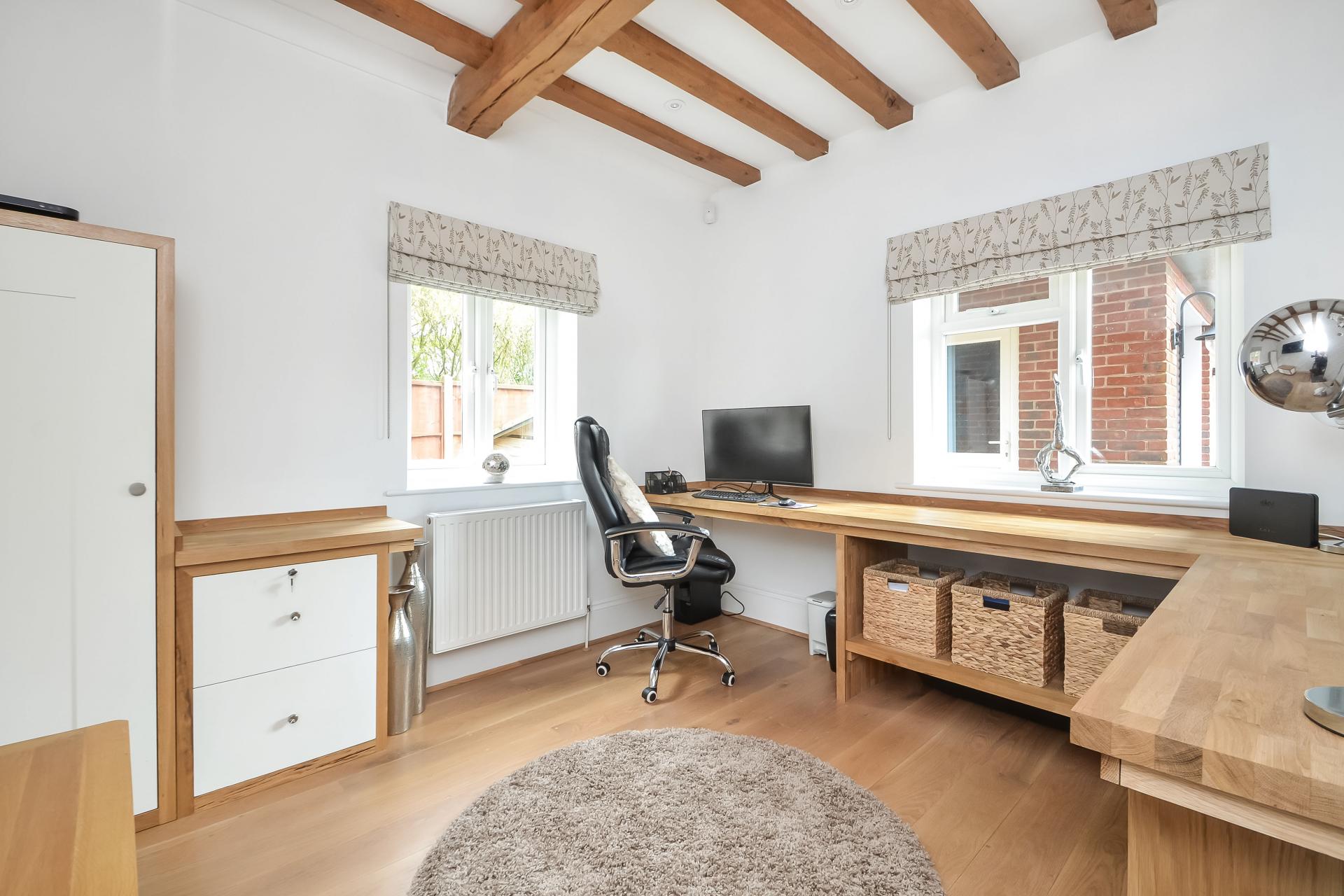 STUDY/HOME OFFICE 11' 1" x 9' 8" (13'5" max) (3.38m x 2.95m) Wooden flooring, double glazed window to front aspect overlooking driveway, double glazed window to side with radiator under, oak block work station with storage shelving, cupboards and drawers under, two built-in cabinets with wood block surface over, bracket and wiring for wall mounted T.V., exposed beams to ceiling, spotlights, glazed panelled door to hallway.