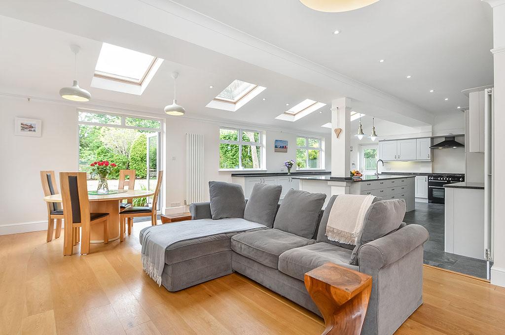 At the back of the house is the open-plan Kitchen/Family/Dining Room (almost 22 ft long x 24 ft at its widest). With glass patio doors, large windows and four skylights, this whole area benefits from a great deal of light.