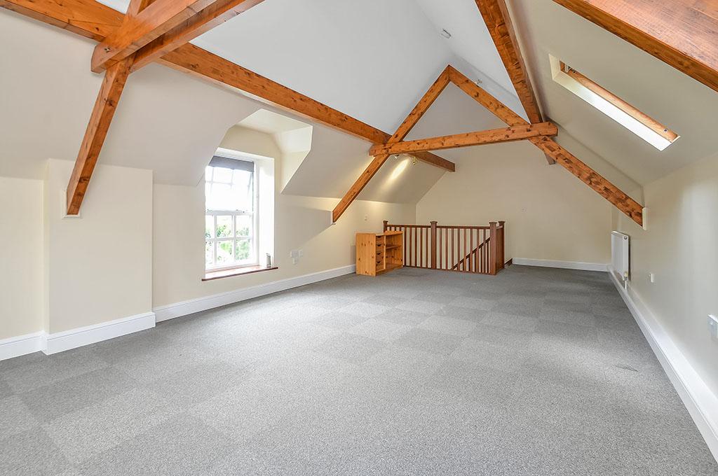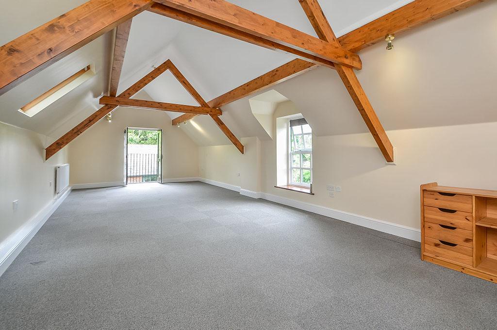 The Coach House, at the end of the garden concealed from the house by high hedging, has a main entrance hallway with a small kitchen and a shower room. The ground floor reception room is over 24 ft long x almost 14 ft wide and the open-plan upper floor over 36 ft long x almost 14ft wide, offering the ability for adaptation if desired.