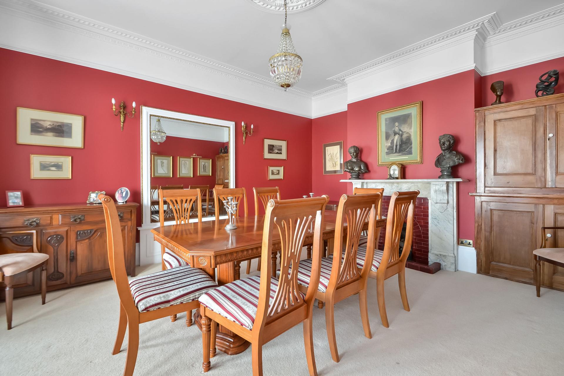 DINING ROOM 19' 6" into bay window x 14' 0" (5.94m x 4.27m) Double glazed full height bay window to front aspect overlooking garden, wooden panelling, original ceiling rose and coving, picture rail, panelled door, high skirting boards, dimmer switches, double radiator, central chimney breast with granite surround fireplace with red tile inlay and hearth and built-in dresser to one side, picture lights.