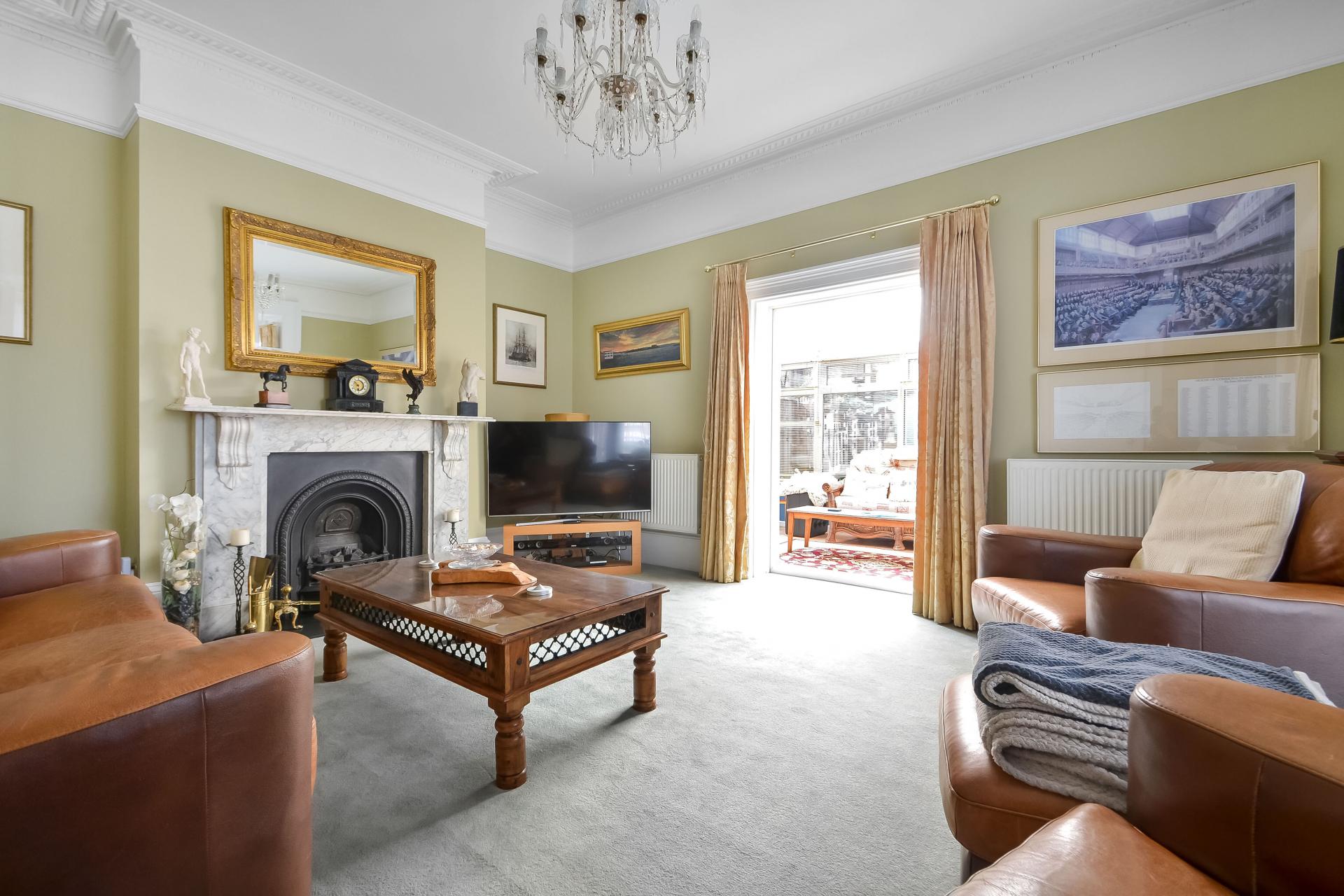 SITTING ROOM 19' 10" into bay window x 14' 1" (6.05m x 4.29m) Full height double glazed sash bay window to front aspect overlooking garden, wood panelling, ceiling rose and coving, picture rail, panelled door, high skirting boards, two radiators, granite surround fireplace with cast iron arched inlay and slate hearth, twin double glazed doors leading to: