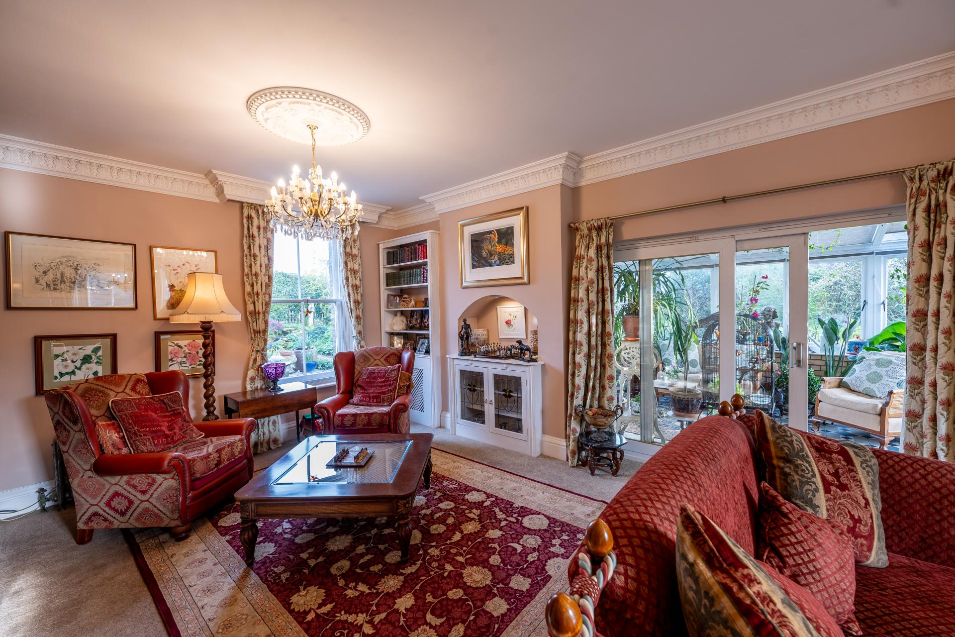 From the reception hall, there is also the 'party room', a generous reception room with triple aspect windows, a beautiful log burner, and plenty of original features. Combined with the conservatory, with its bar area, it's perfect for entertaining family and friends.