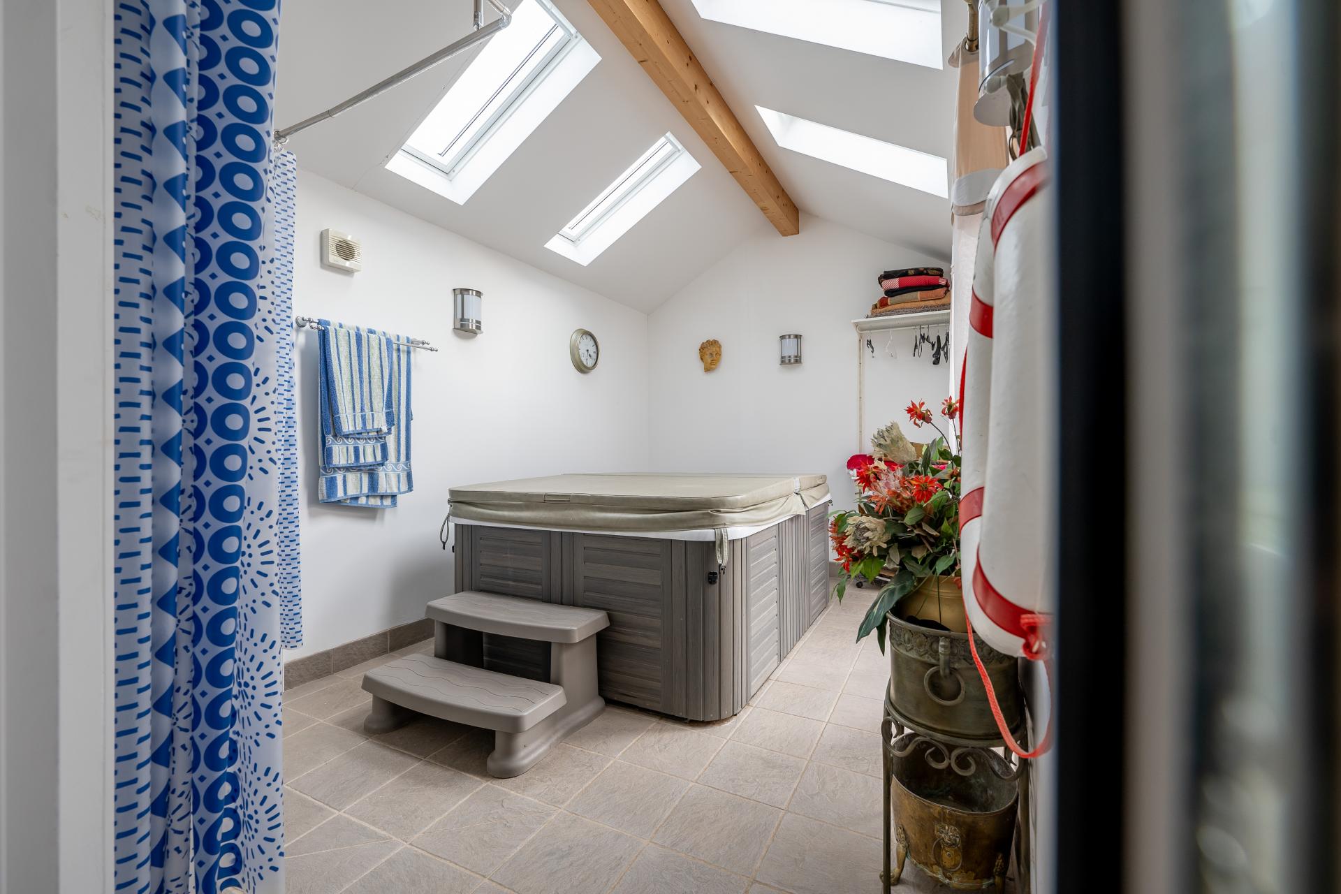 A utility room, off the kitchen, gives access to the new extension; a secondary kitchen, flooded with light streaming through the skylights in the stunning vaulted ceiling. From here there's access to the garaging and the Spanish inspired hot tub room. As well as the hot tub itself, this room benefits from tiled flooring, underfloor heating, vaulted ceiling with skylights, bi-fold doors to the courtyard garden and a shower.