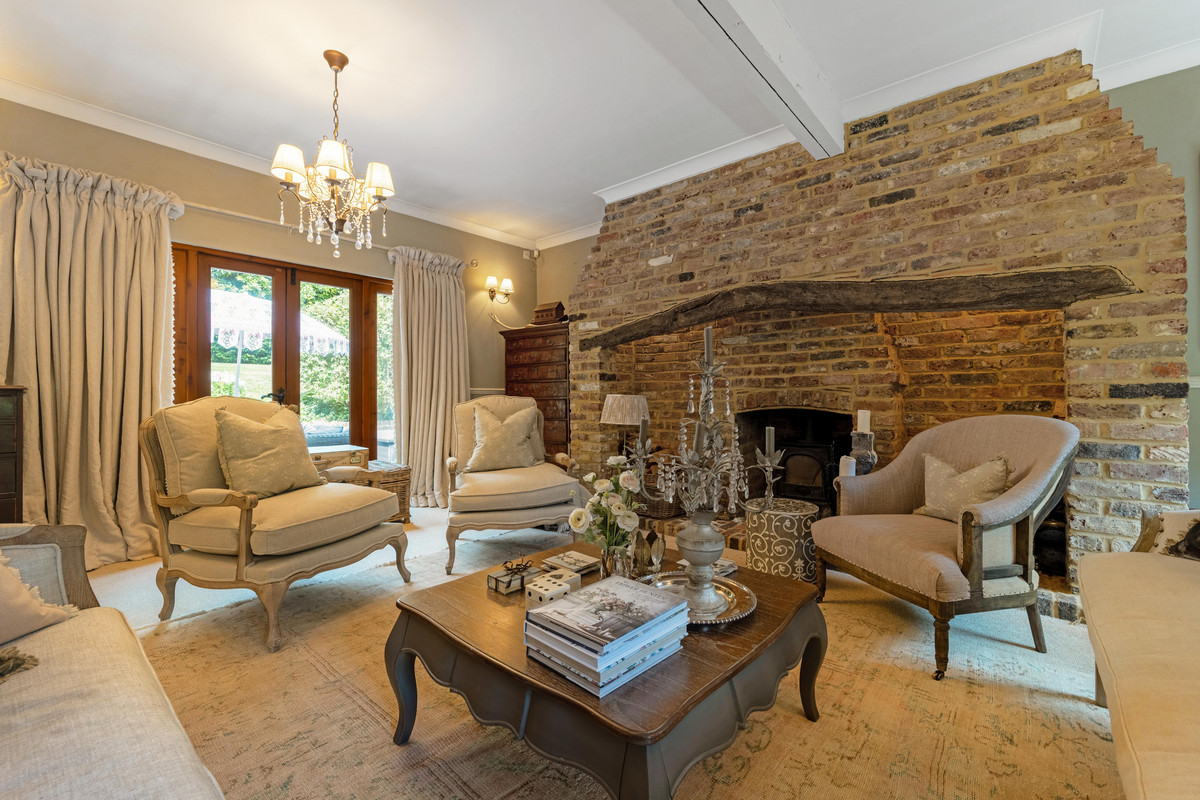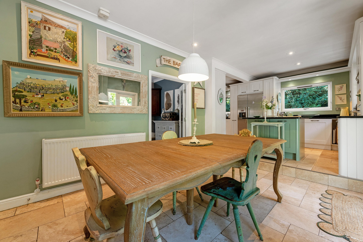 The sitting room transitions seamlessly into the family room, complete with a striking feature fireplace and exposed, painted beams that add warmth and character. To the left of the sitting room lies the open plan dining room, which connects directly to a beautifully appointed modern country style kitchen.