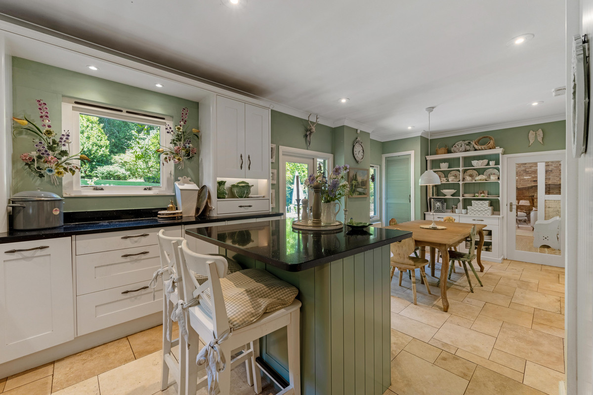 A charming central island creates the natural hub of the home — perfect for casual breakfasts or gathering with friends. Fitted with matching wall and base units topped with granite work surfaces, the kitchen enjoys delightful views across the garden, making it as much a pleasure to cook in as it is to spend time in.