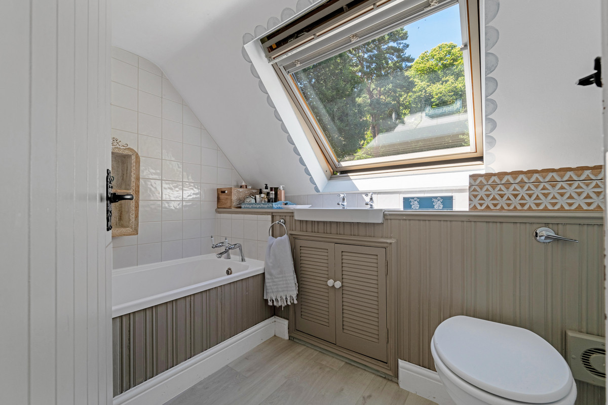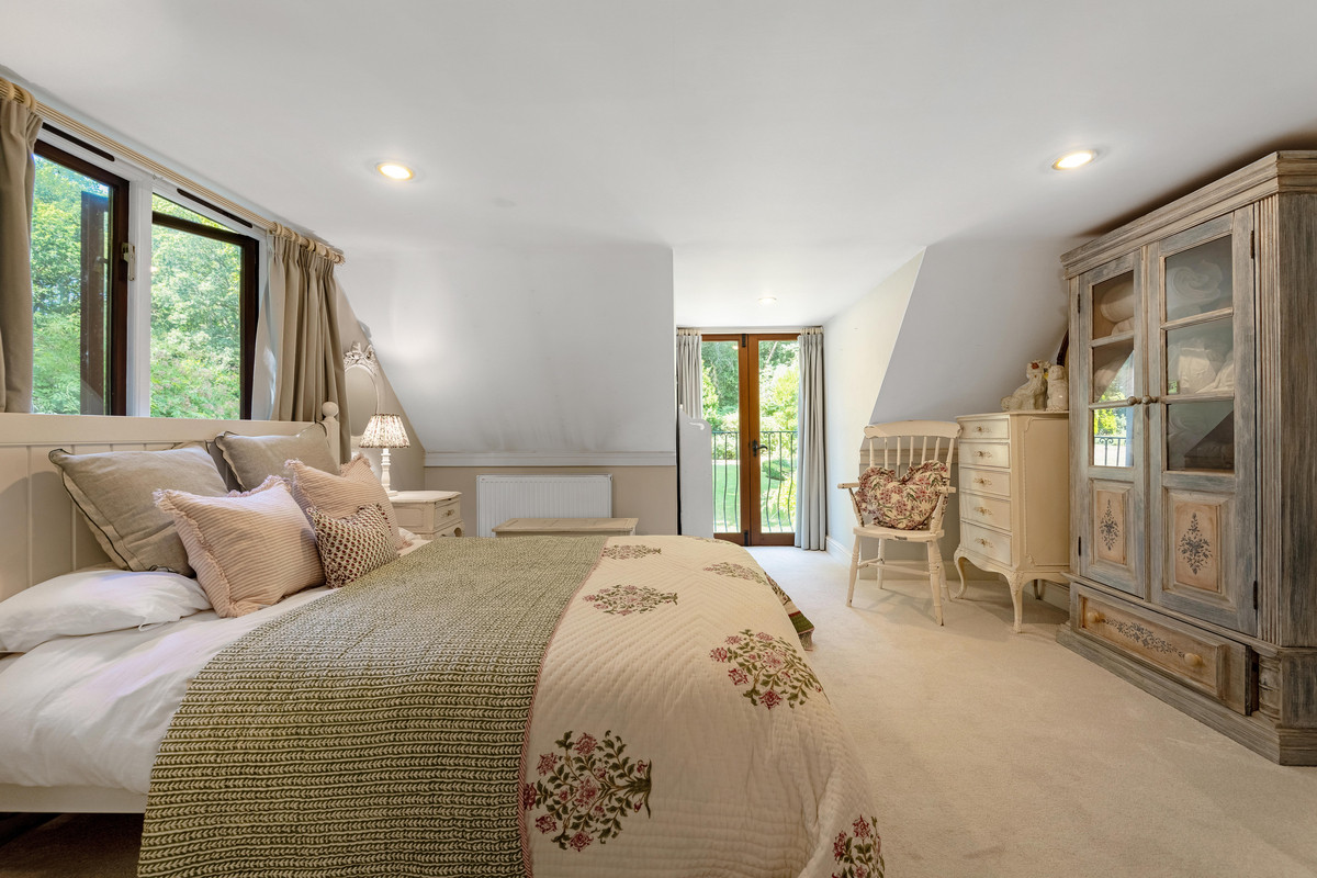The dual aspect principal bedroom is a true sanctuary, complete with a charming Juliet balcony that frames breathtaking views across the gardens to the woodland beyond. This room also enjoys a well-appointed en suite, creating a private retreat within the home.