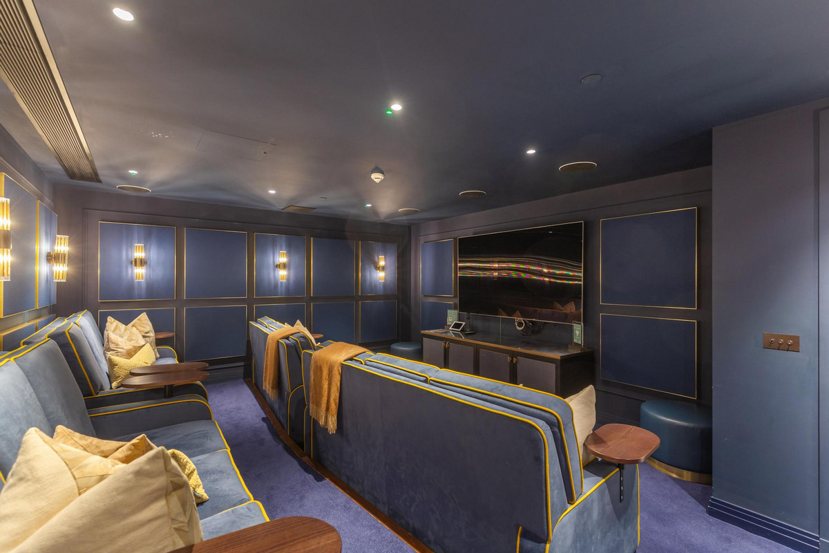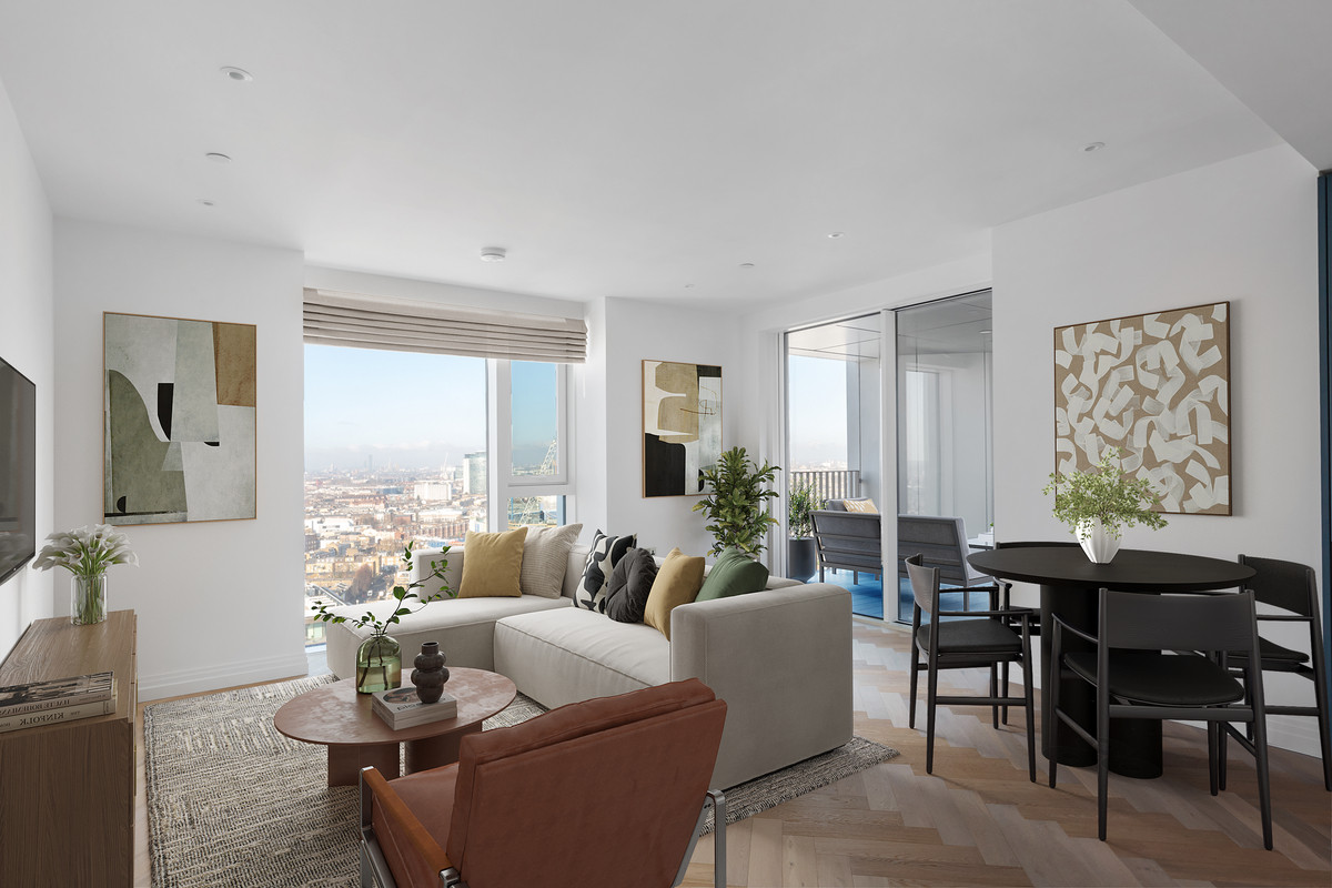 The open-plan lounge and dining area truly set this apartment apart. Natural light floods the space from multiple angles, and the 21st-floor location ensures a sense of privacy and tranquillity—an uncommon feature in London. The kitchen is fitted with Miele appliances, while the herringbone flooring and gold finishes add character and warmth to the contemporary design.
