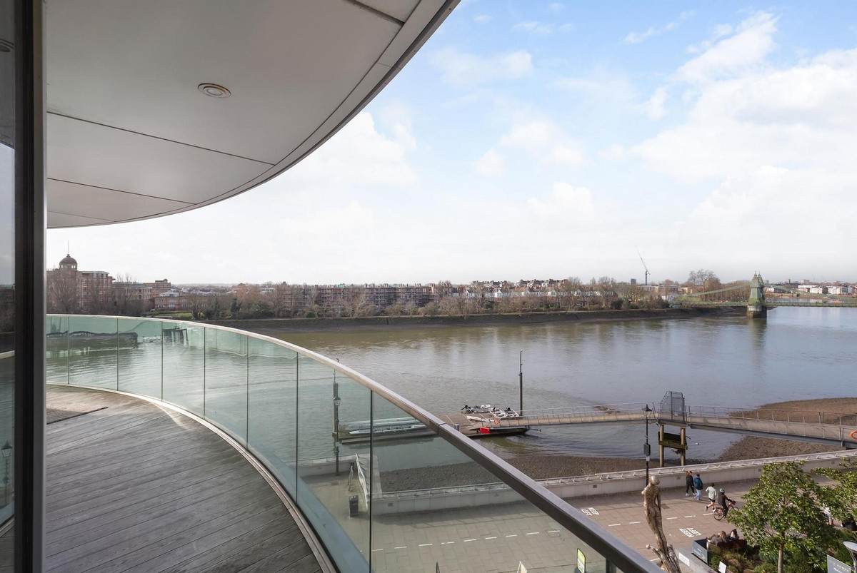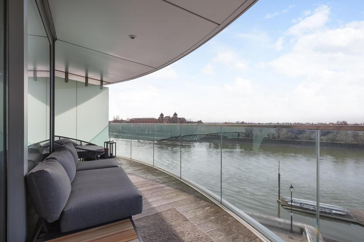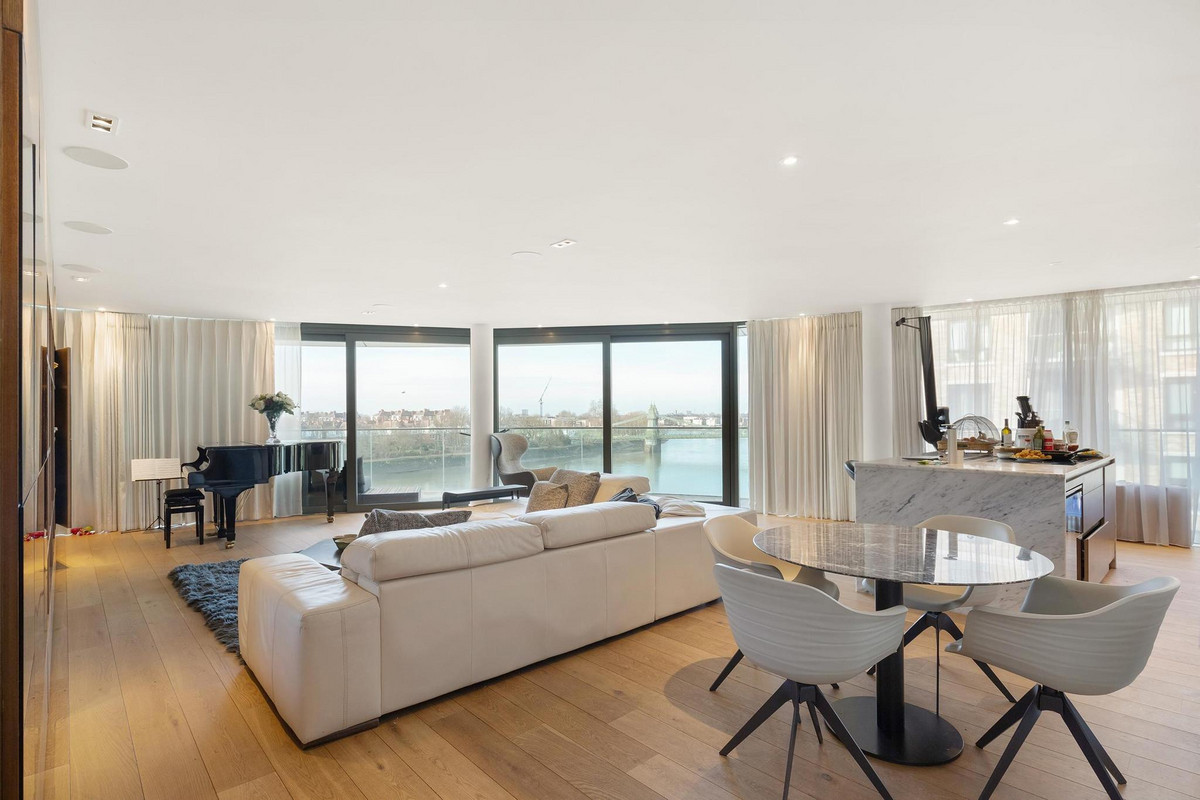 Entering the open-plan lounge / dining area is really where this apartment differs from many others. The unique shape of the apartment allows for panoramic views of the Thames, accessed via a private wrap-around balcony. This coupled with the apartment being located on the fourth floor provides privacy and tranquillity - something rather rare to find in London.