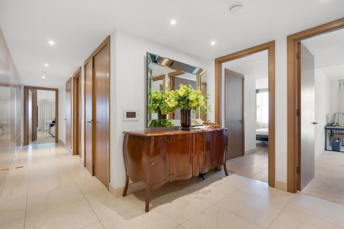Upon entering, you immediately feel a sense of openness and space, walking into an expansive entrance hall granting you access to each wing of the apartment. To your right, you will find two bedrooms and two bathrooms, one of which is the principal suite and both boasting bespoke fitted storage and east-facing sun. A little further down the entrance hall you will find the final bedroom, which again has bespoke storage and has direct access to a family bathroom. All bedrooms are extremely well proportioned, and the bathrooms have been finished with luxury in mind.