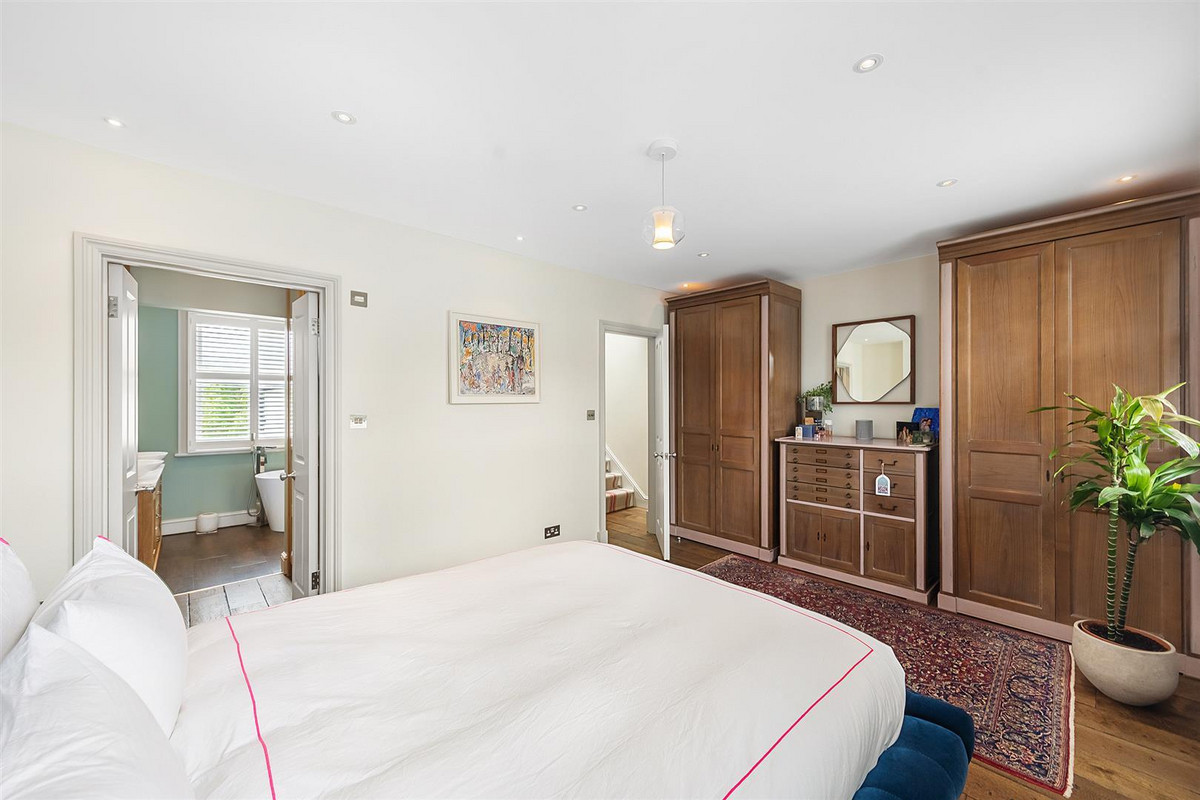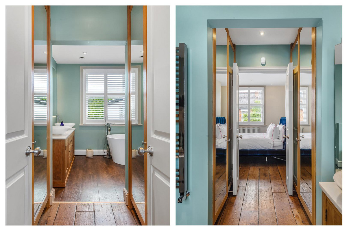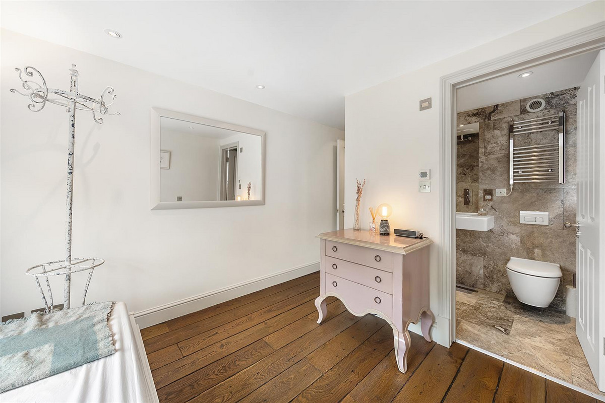 On the first floor a large main bedroom spans the width of the house, with a pair of shuttered sash windows, a dressing area with fitted wardrobes, and a luxurious en suite bathroom with double vanity unit, free standing bath and walk-in rainfall shower. A further double bedroom on the first floor has an en suite shower room.