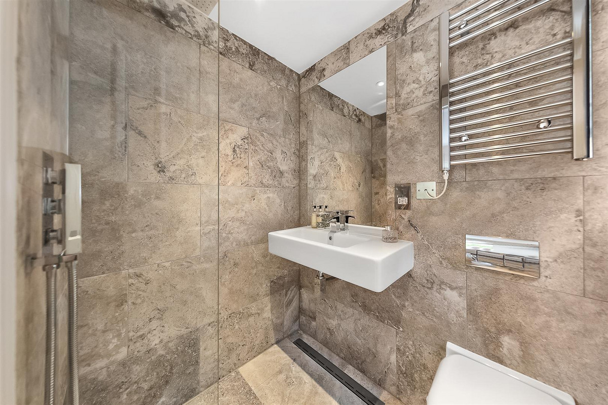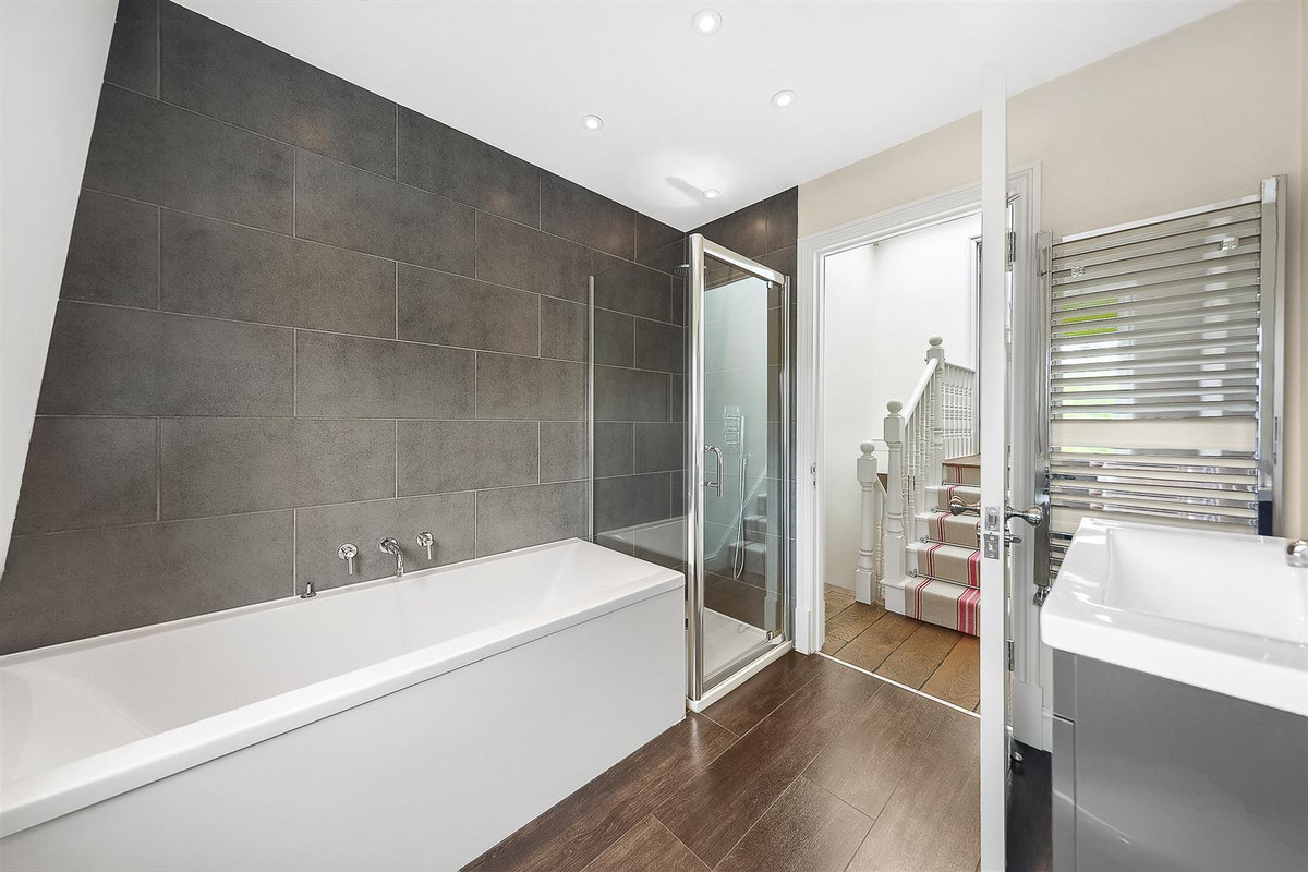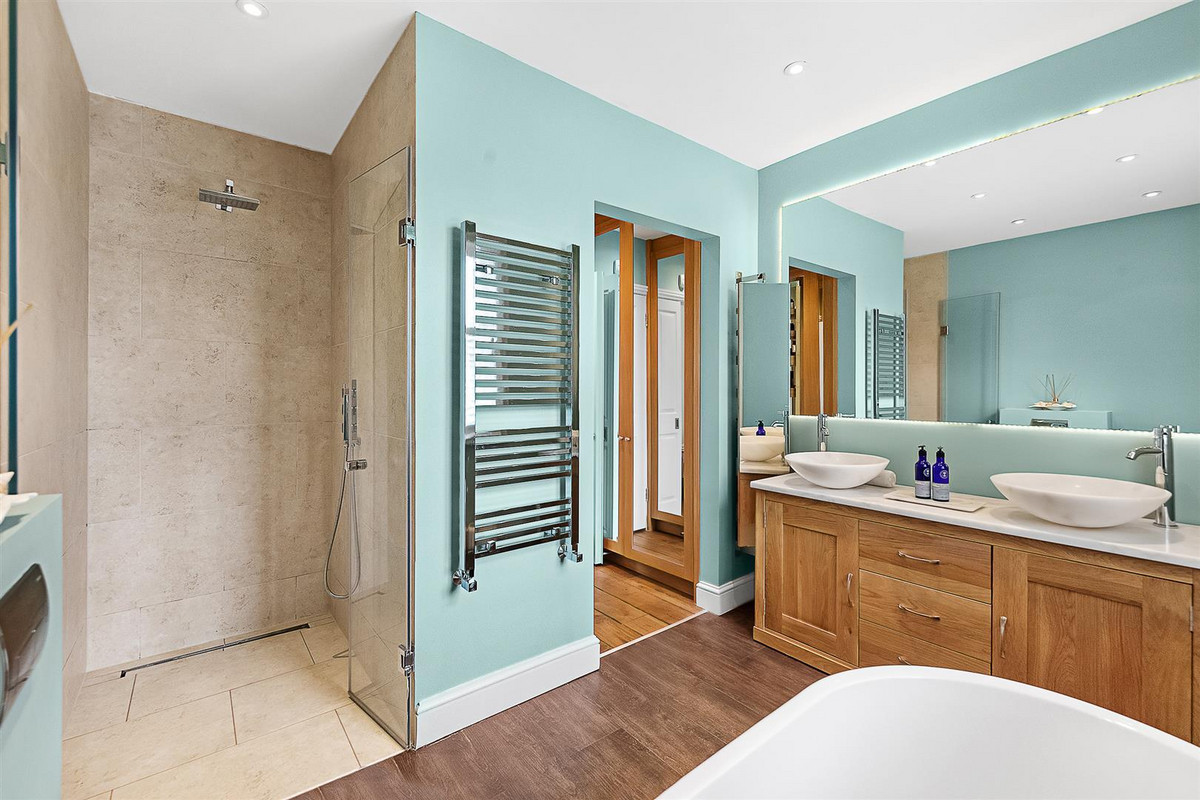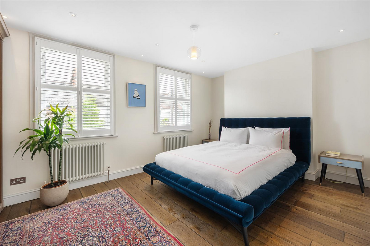 On the first floor a large main bedroom spans the width of the house, with a pair of shuttered sash windows, a dressing area with fitted wardrobes, and a luxurious en suite bathroom with double vanity unit, free standing bath and walk-in rainfall shower. A further double bedroom on the first floor has an en suite shower room.