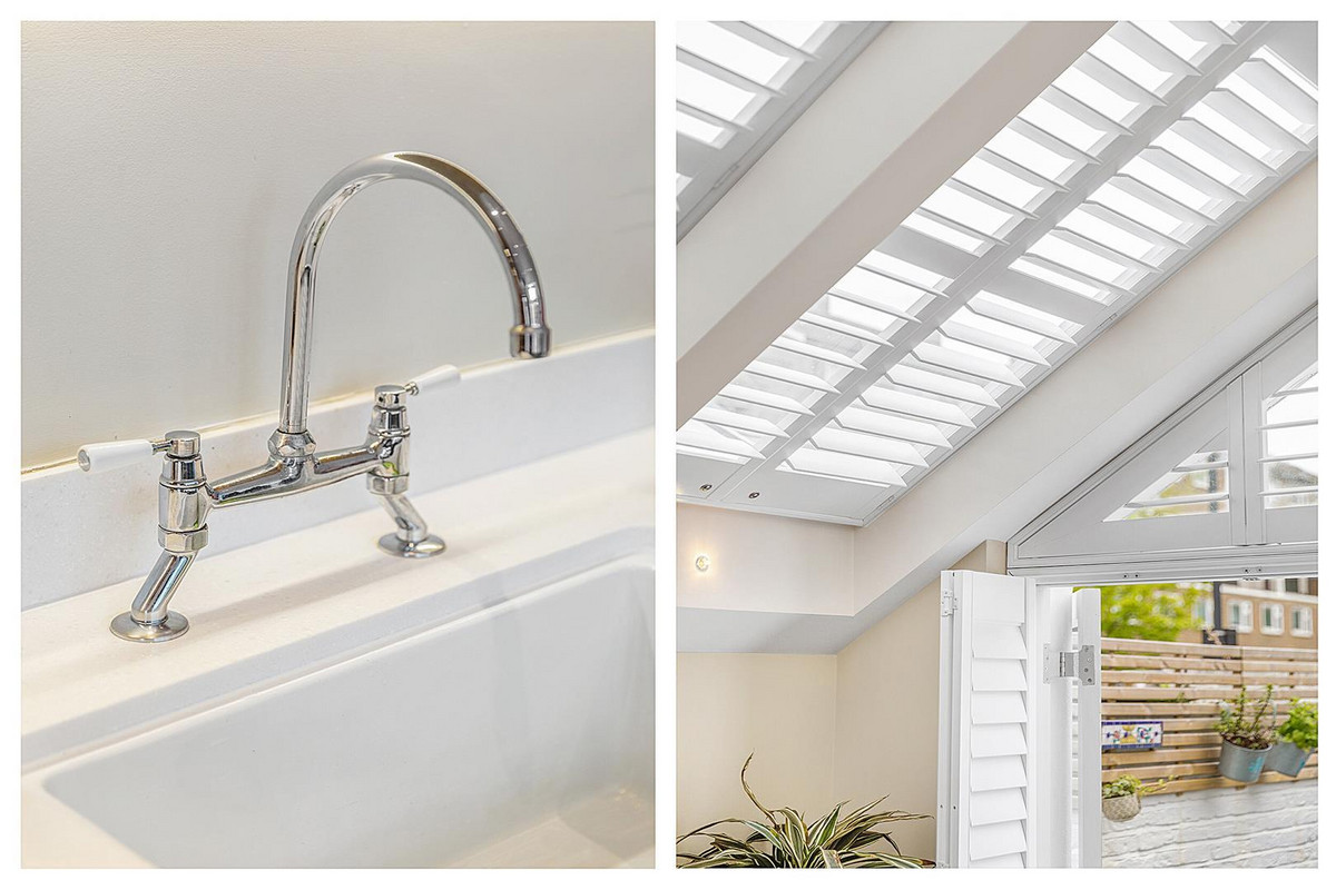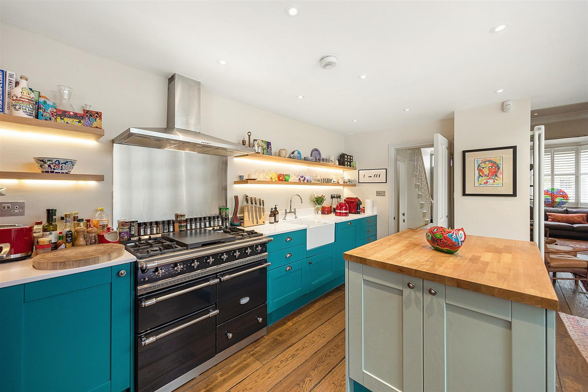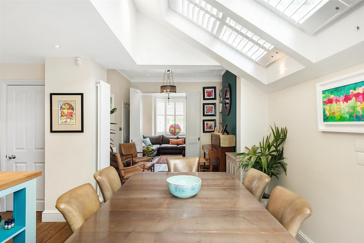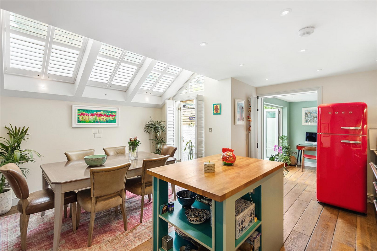 The front living room features cornices, bespoke joinery and a fireplace with marble surround. A south-facing bay window with sash frames and fitted shutters bathes the room in natural light. Folding doors lead into the rear living area, providing the opportunity to create a separate space when required, and wooden floors unite all the ground floor spaces. The rear living area is semi-open plan to the kitchen and dining area, perfect for a playroom or informal family living room. The dining area features a dramatic vaulted, part-glazed ceiling with fitted shutters and French windows to the garden. The adjacent kitchen has been recently refitted with stylish base units, a range cooker, butcher’s block island unit and shelves with integrated lighting. Beyond the kitchen is an area ideal for working from home or for hobbies, with a guest cloakroom, storage cupboard and bifolding doors to the garden. A large utility room with ample headroom and fitted storage is positioned on the lower ground floor.