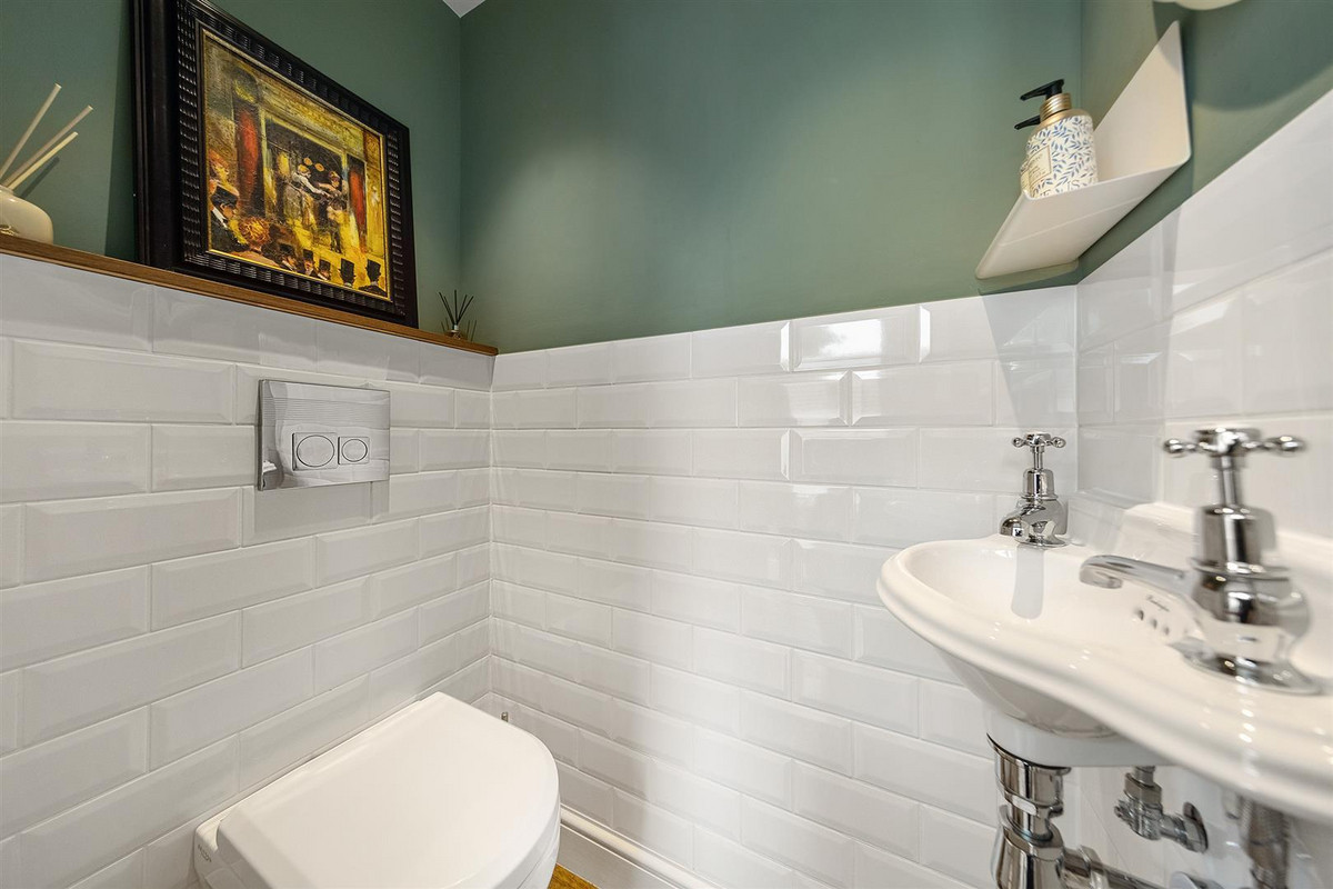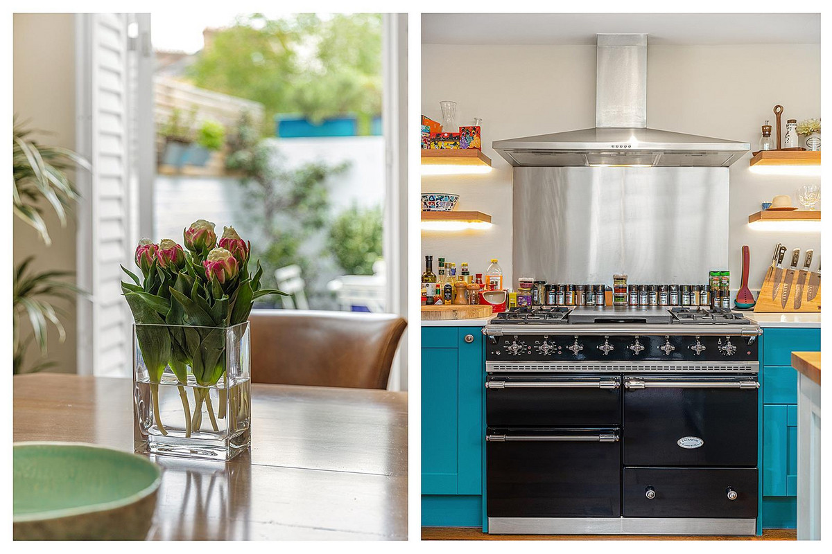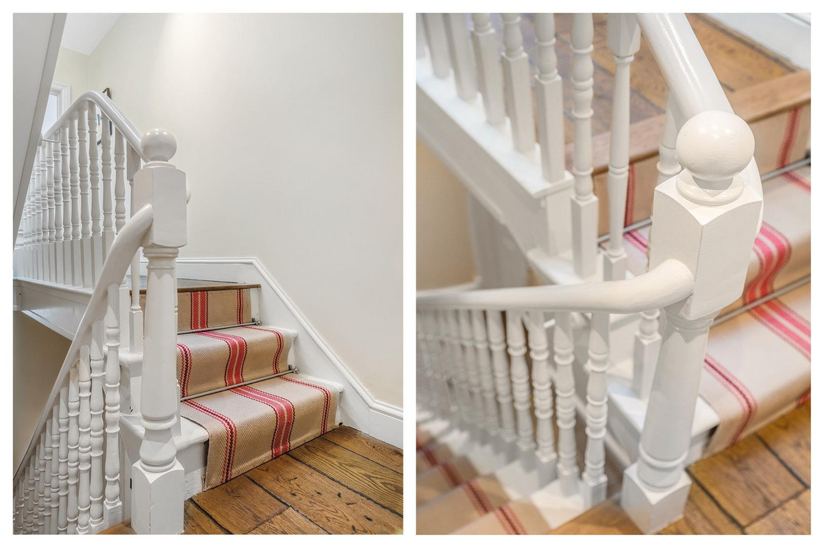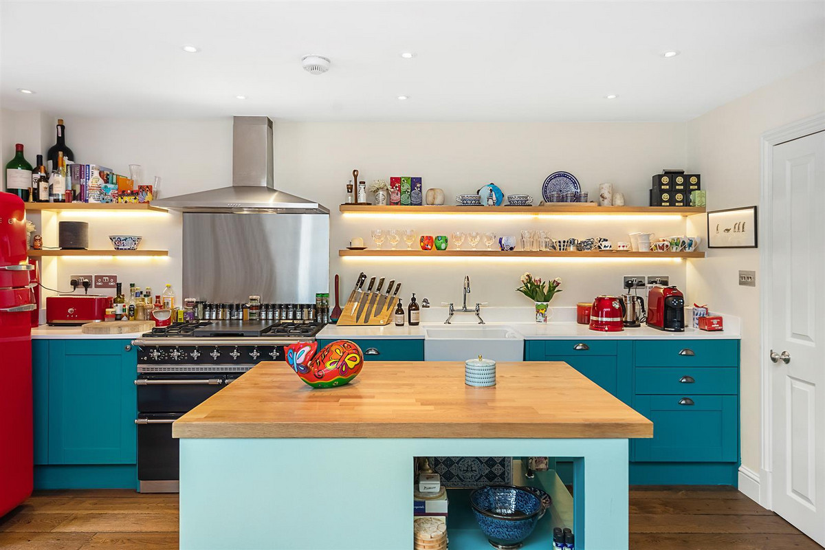 The front living room features cornices, bespoke joinery and a fireplace with marble surround. A south-facing bay window with sash frames and fitted shutters bathes the room in natural light. Folding doors lead into the rear living area, providing the opportunity to create a separate space when required, and wooden floors unite all the ground floor spaces. The rear living area is semi-open plan to the kitchen and dining area, perfect for a playroom or informal family living room. The dining area features a dramatic vaulted, part-glazed ceiling with fitted shutters and French windows to the garden. The adjacent kitchen has been recently refitted with stylish base units, a range cooker, butcher’s block island unit and shelves with integrated lighting. Beyond the kitchen is an area ideal for working from home or for hobbies, with a guest cloakroom, storage cupboard and bifolding doors to the garden. A large utility room with ample headroom and fitted storage is positioned on the lower ground floor.