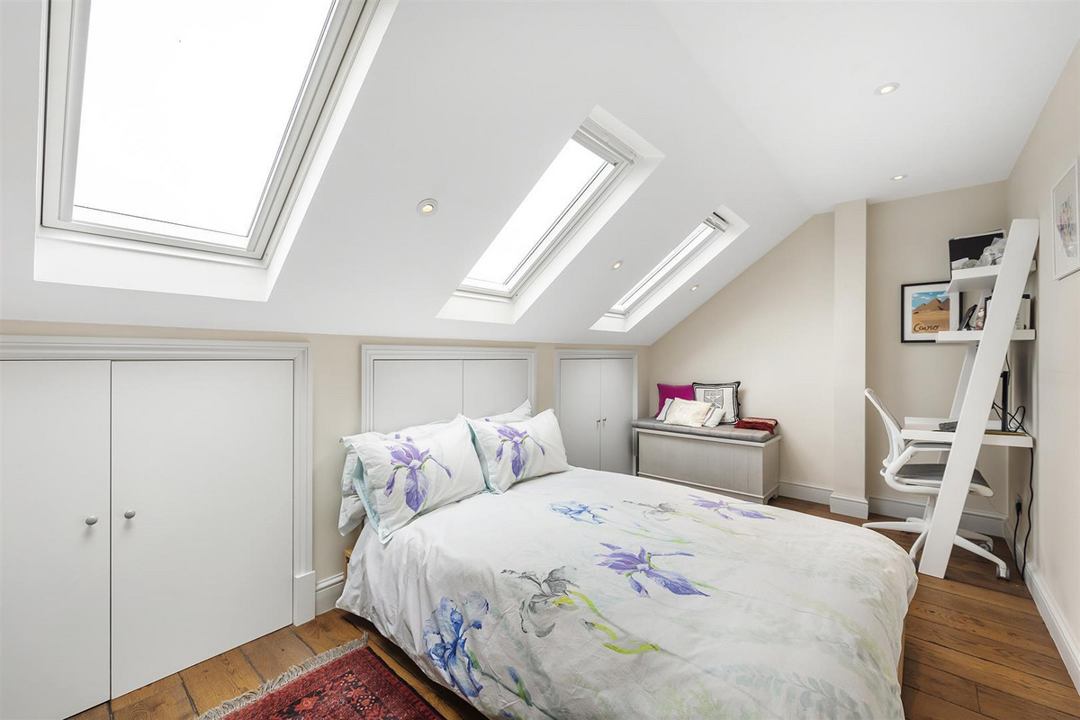 Two more double bedrooms are located on the second floor, one with three skylights and the other with a Juliet balcony, both served by a bathroom with a double-ended bath and a separate shower. The stairs and landing are naturally lit by a large skylight overhead, and there is extensive under-eaves storage space.