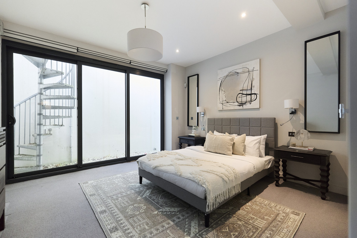 Spanning four levels, the ground floor features a beautiful kitchen that overlooks one of two reception rooms, complete with floor-to-ceiling glass doors opening onto a meticulously maintained patio garden. Stairs lead to the lower ground floor, where you'll find the second reception/family room, a WC, a separate utility room, and a spacious double bedroom with built-in wardrobes and an en suite bathroom.