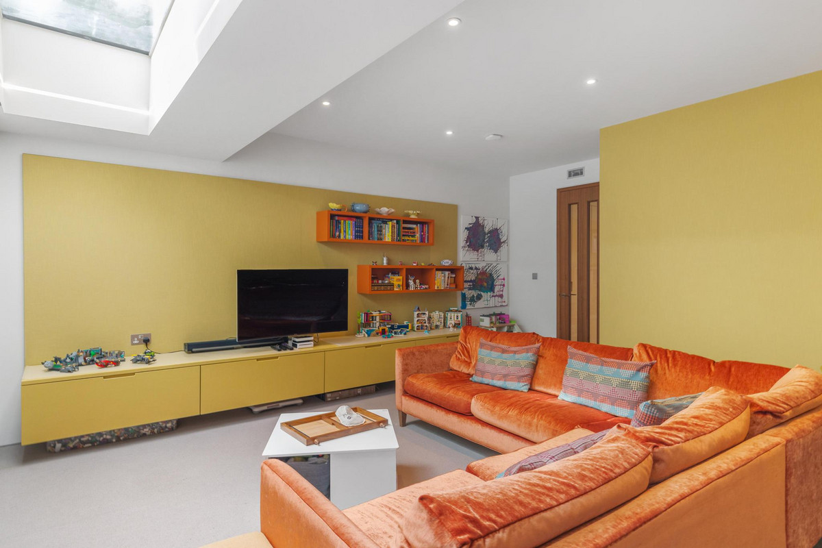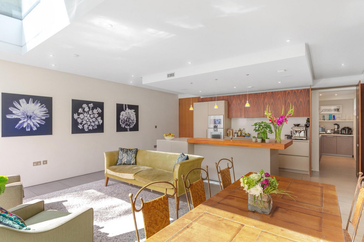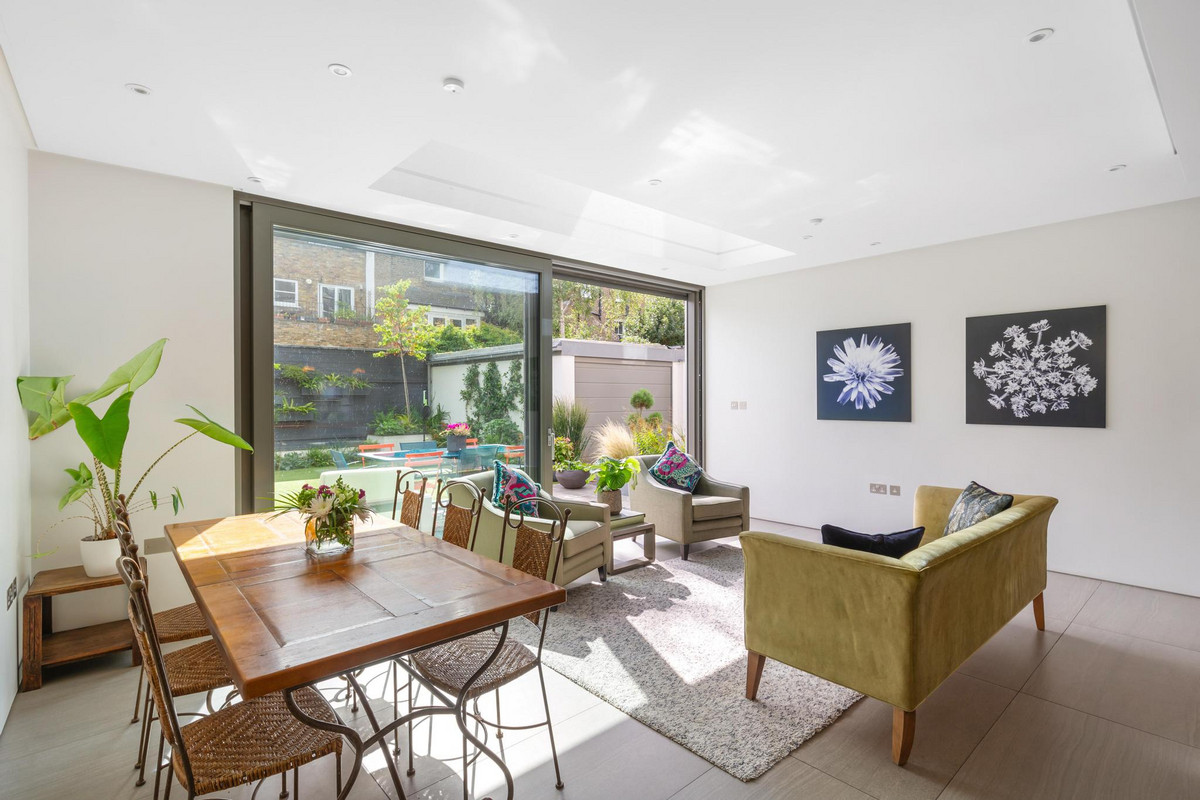 Arranged over four levels, the house is defined by volume and light, with 2.9m ceilings on every floor. At its heart lies an open-plan kitchen, dining and family space opening seamlessly onto the landscaped garden through expansive glass doors. Designed by Extreme Design and fitted with Gaggenau appliances, the kitchen includes a striking hidden larder concealed behind bespoke walnut joinery.