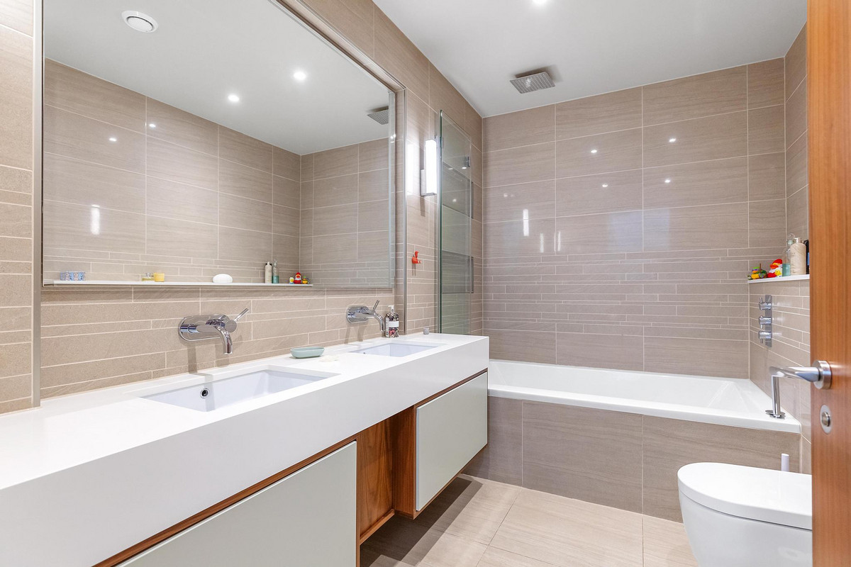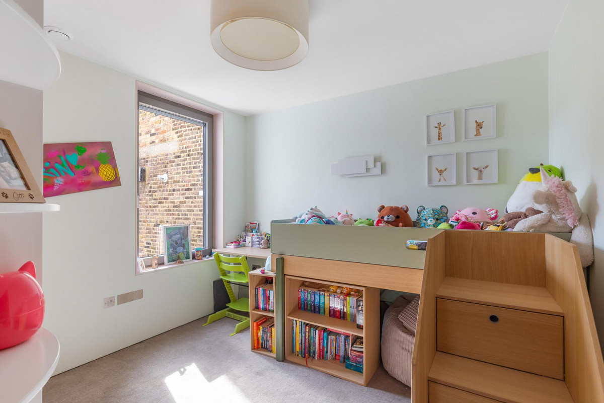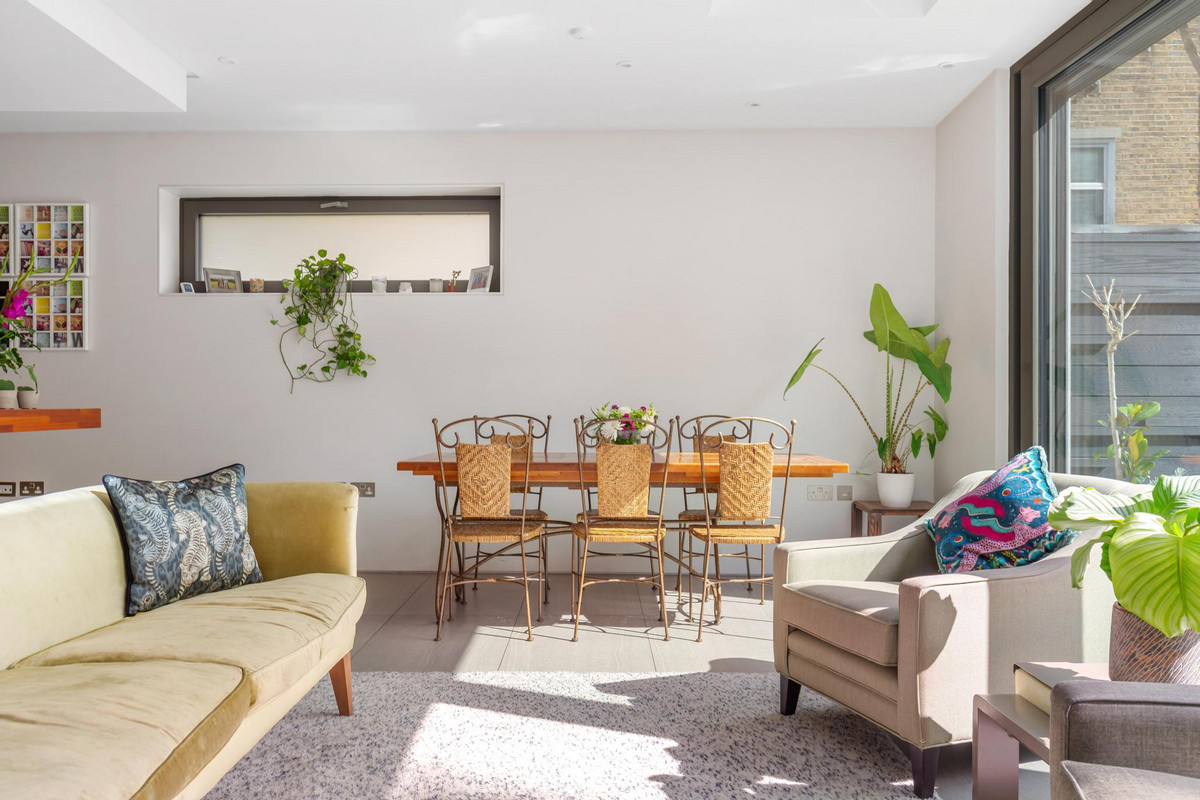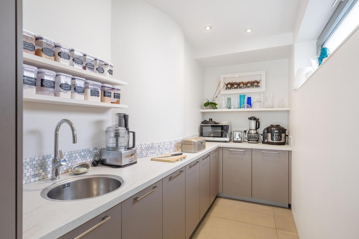 Arranged over four levels, the house is defined by volume and light, with 2.9m ceilings on every floor. At its heart lies an open-plan kitchen, dining and family space opening seamlessly onto the landscaped garden through expansive glass doors. Designed by Extreme Design and fitted with Gaggenau appliances, the kitchen includes a striking hidden larder concealed behind bespoke walnut joinery.