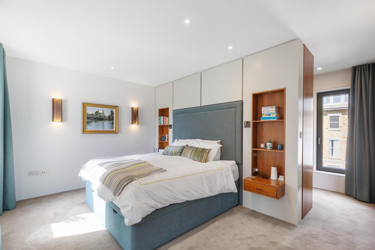 The upper levels offer five bedrooms and three bathrooms, culminating in a principal suite that occupies the entire second floor. This includes a dressing area, bespoke wardrobes, and a large en-suite bathroom.