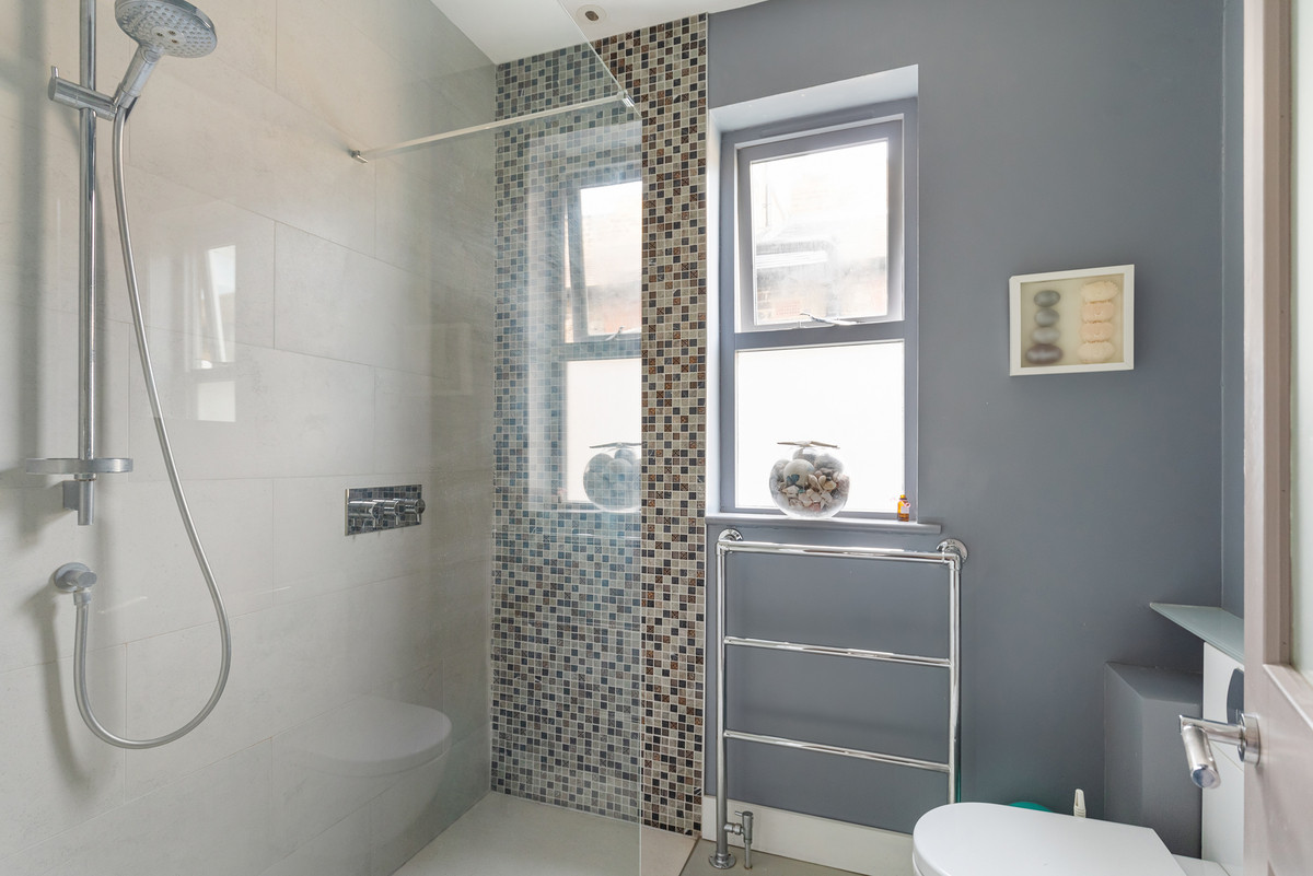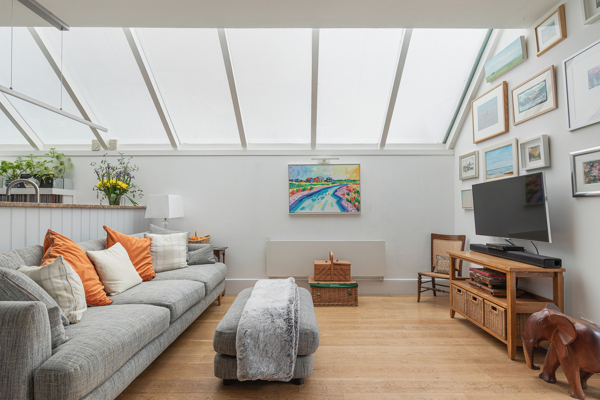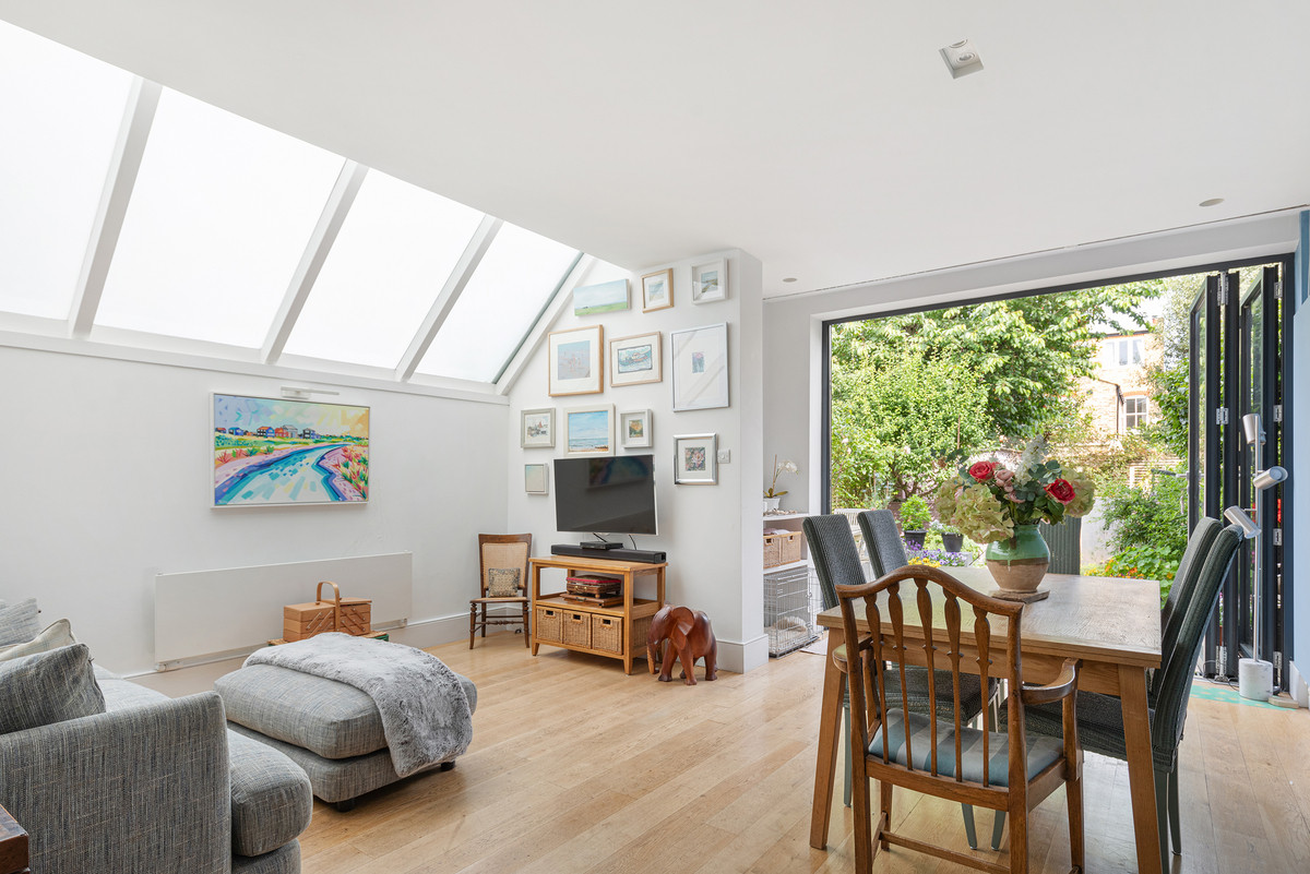 The kitchen, which can be found at the rear of the property is accessed either through the reception room, or via the entrance hallway. Again, the theme of natural light is ever evident with the use of velux windows and bifolding doors leading out to a well-manicured 45 ft garden. The kitchen itself boasts bespoke fitted cabinetry, a rangemaster cooker / oven, a breakfast bar in addition to formal dinner seating, and a lounge area.