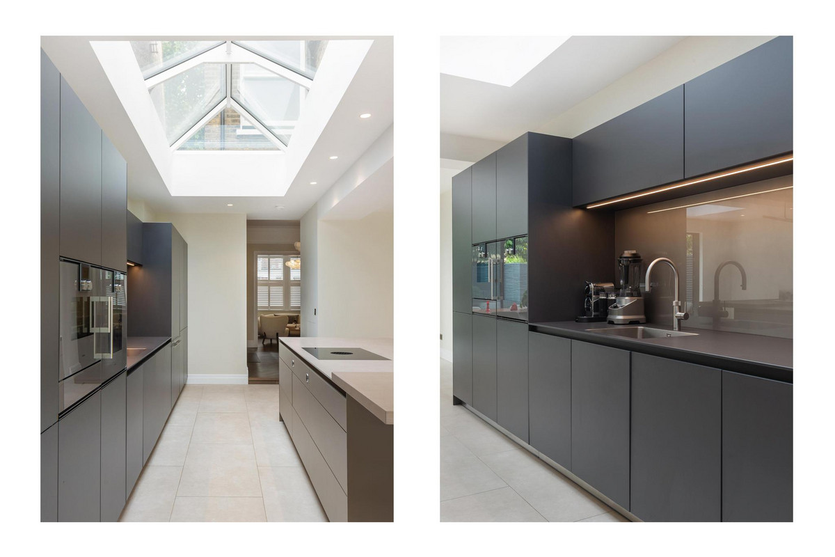 At the rear, the 30-foot kitchen and family room is a showpiece of contemporary design, centered around a large bespoke kitchen island that provides ample space for cooking and gathering. The kitchen boasts bespoke Bulthaup cabinetry, ceramic work surfaces, state-of-the-art Gaggenau appliances, a Quooker tap, and underfloor heating, all contributing to a sleek and functional environment. A separate feature fireplace enhances the informal seating area, creating a cozy atmosphere. Floor-to-ceiling aluminum sliding doors open directly onto the 43-foot landscaped garden, creating a perfect setting for both relaxation and entertaining.