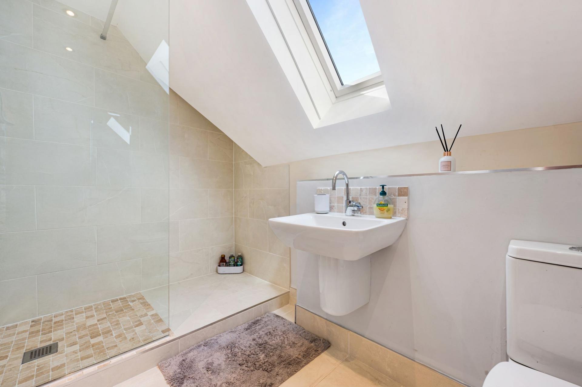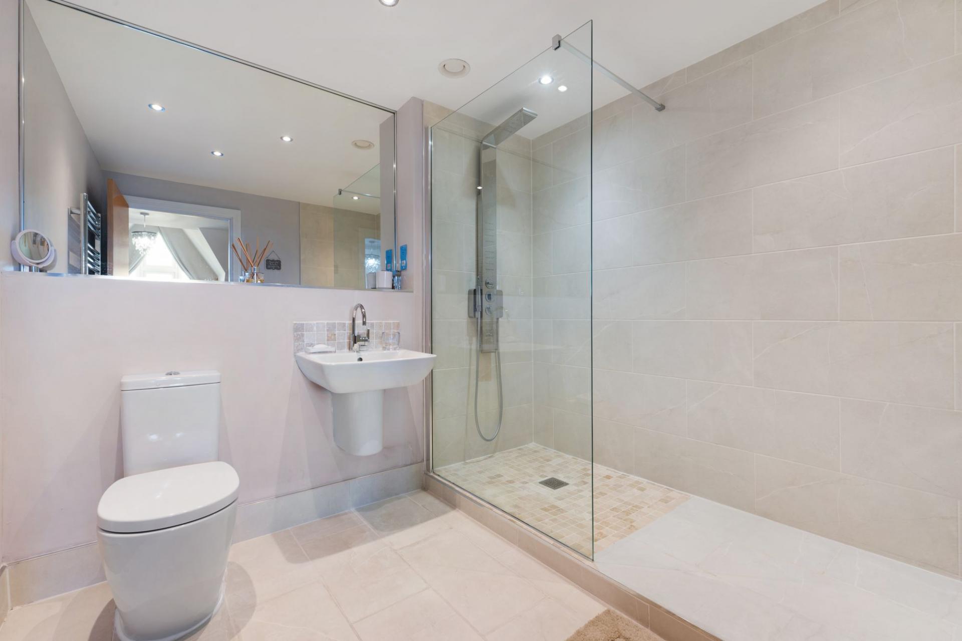 A modern family bathroom is also located on the first floor, with floor-to-ceiling tiling and high-end fixtures that further enhance the sense of refinement throughout.