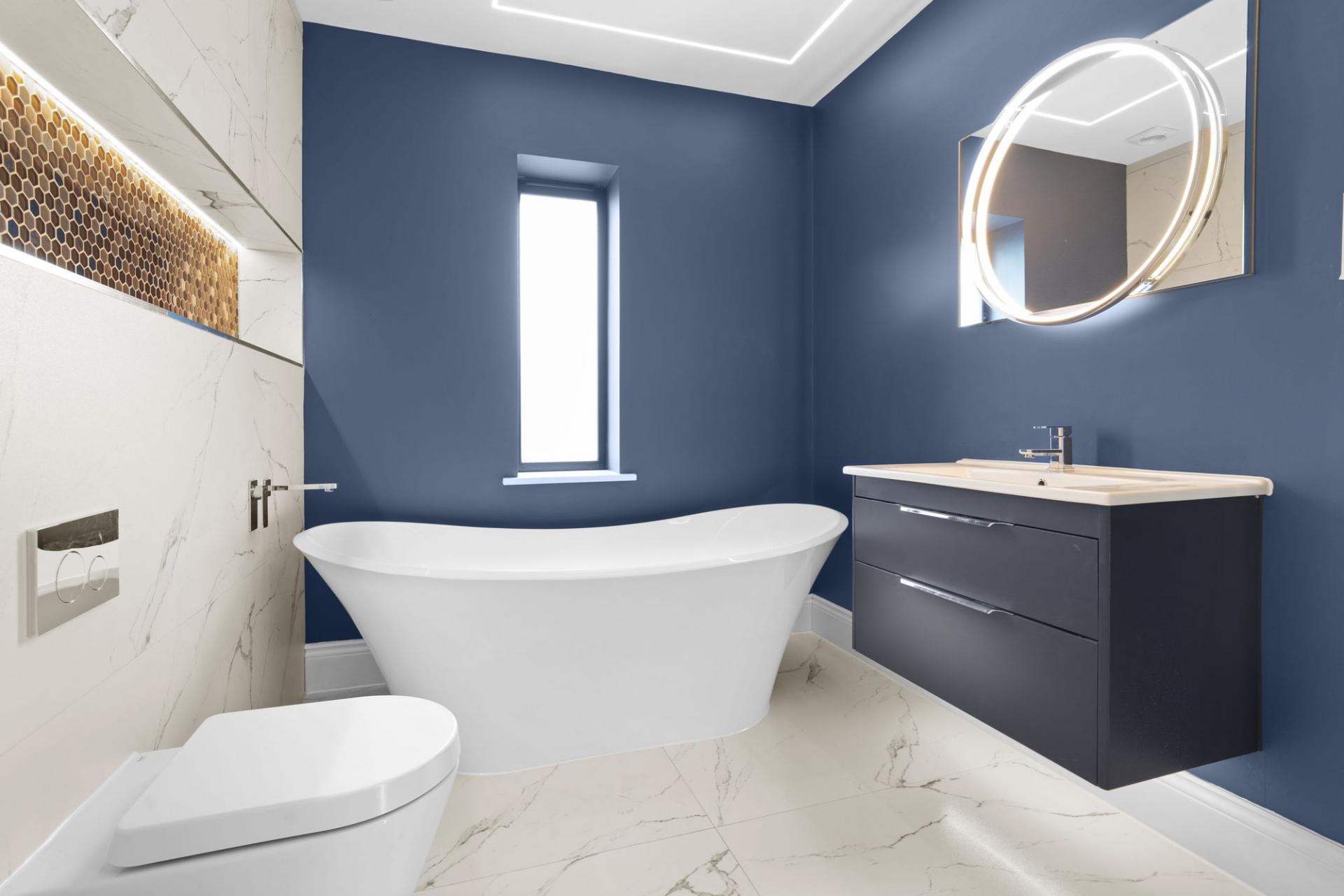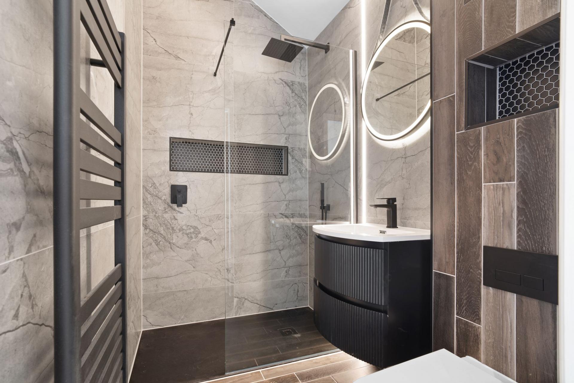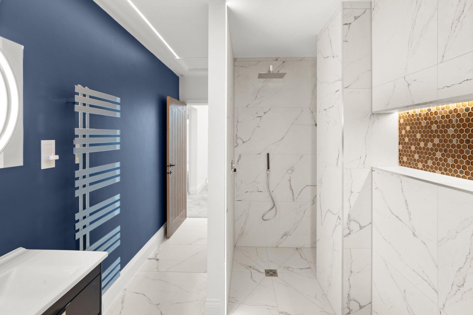 The three further bedrooms share easy access to the family bathroom, which is designed to the same exacting standards. The bathroom features a stand-alone bath perfect for relaxing soaks, a separate walk-in shower, and elegant illuminated niches that add a touch of sophistication.