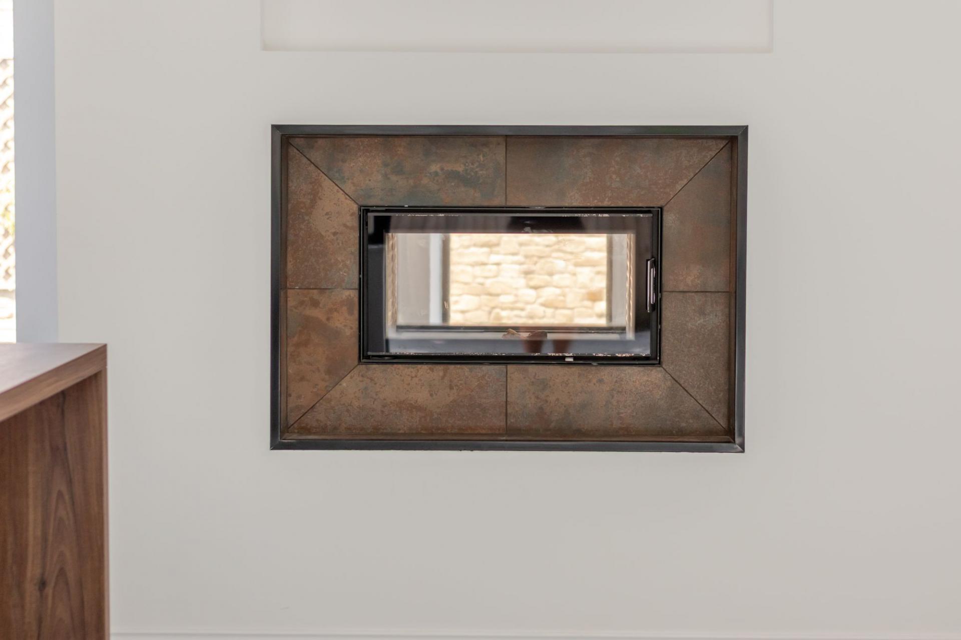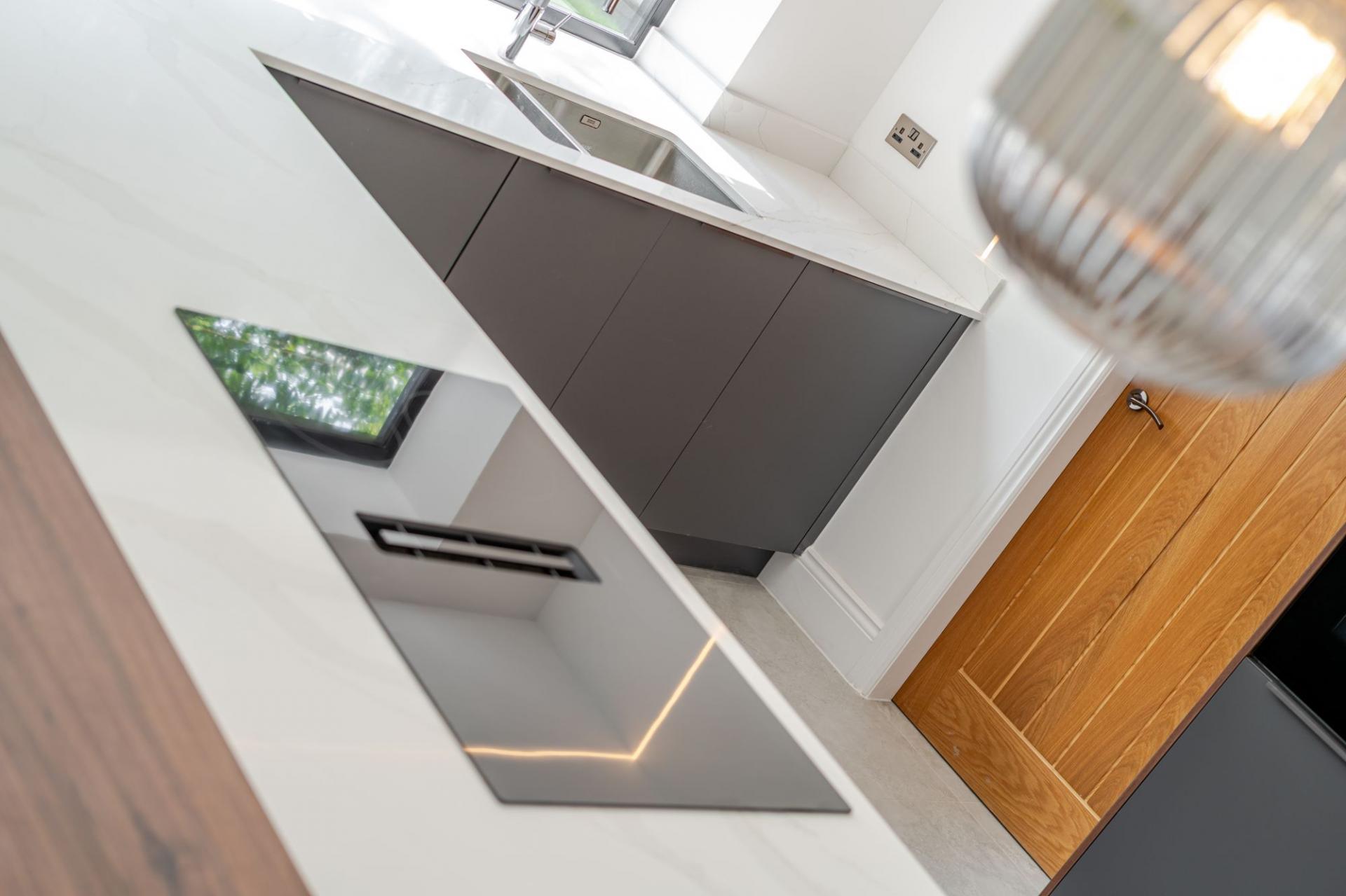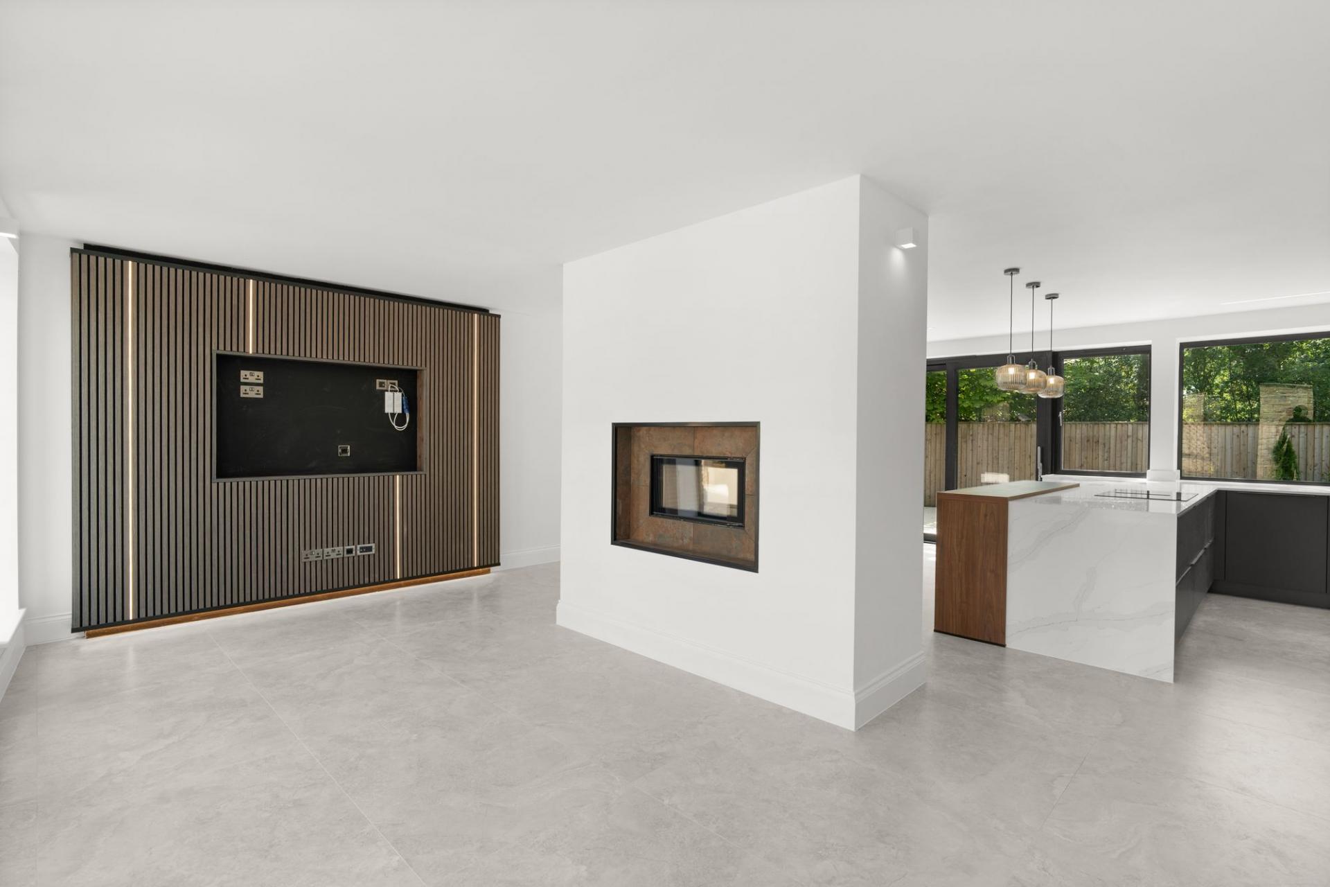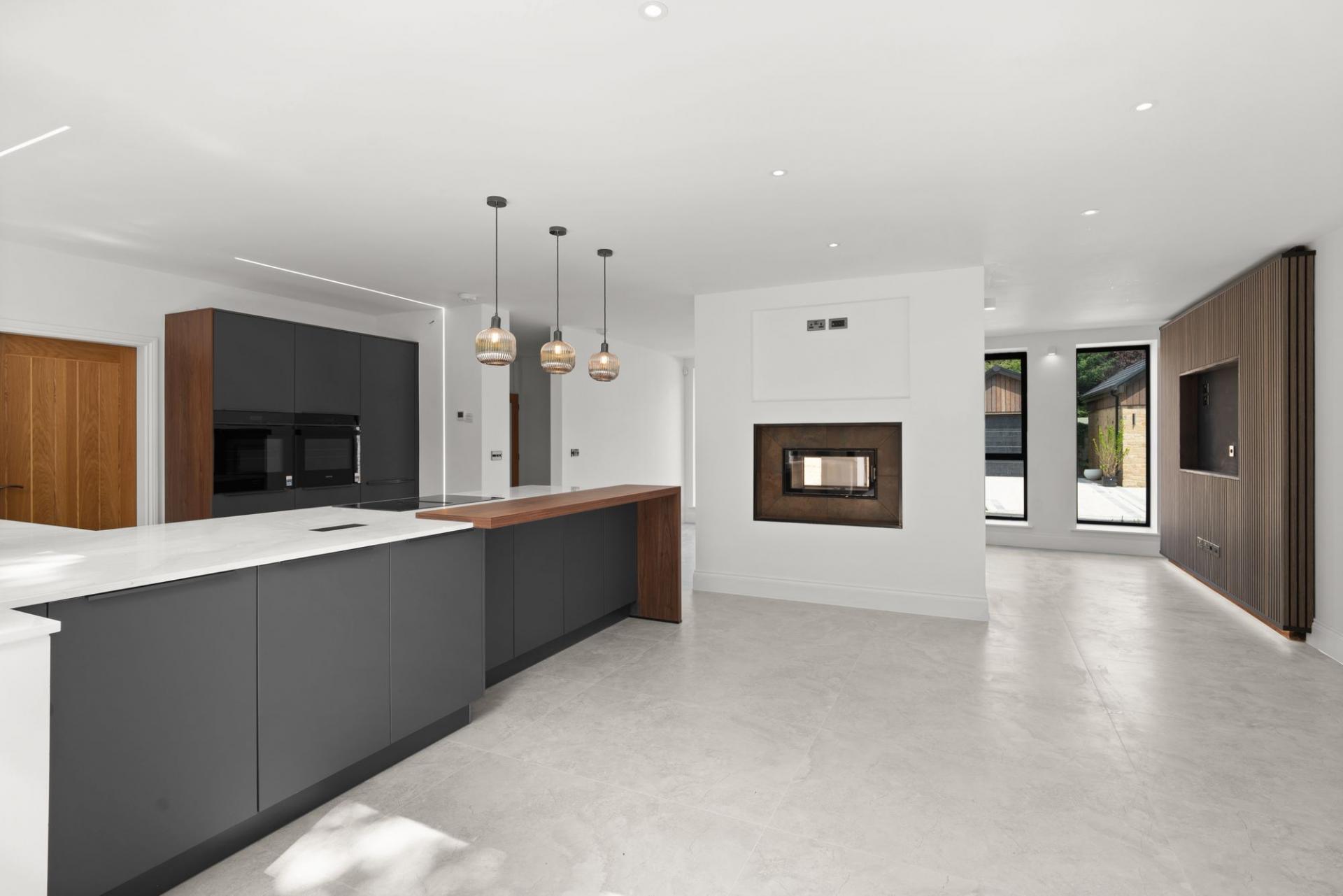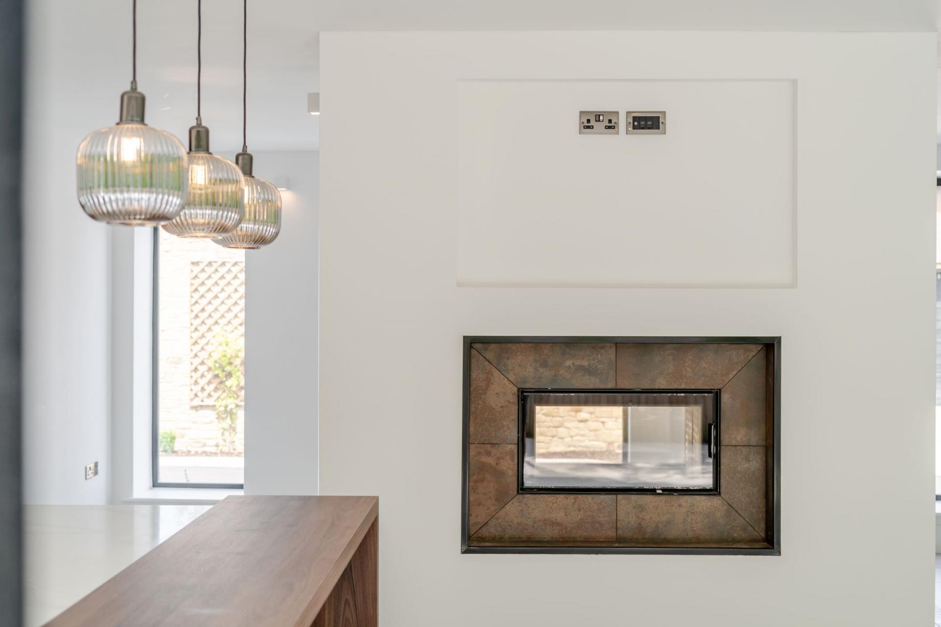 A striking stone-built, dual-aspect fireplace with integrated log burner separates the spaces, offering a dramatic yet homely centrepiece visible from every angle. The handmade kitchen, designed and installed in partnership with ULMO Kitchens, is a triumph in both function and finish: German-engineered, hand-assembled cabinetry, sleek quartz worktops and high-end Siemens appliances all feature as standard — including a self-cleaning oven, induction hob and integrated fridge, freezer and dishwasher.