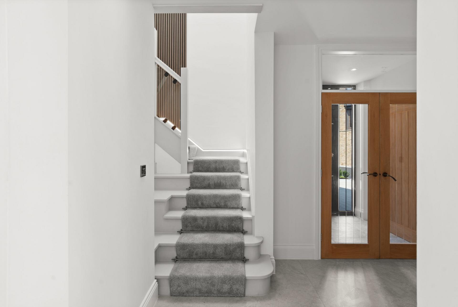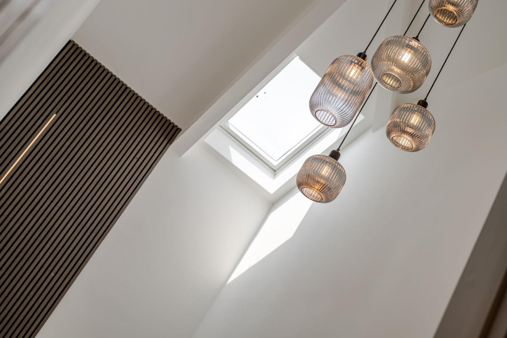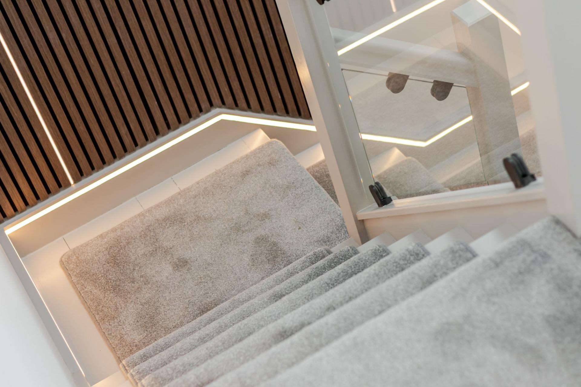 Step inside, and the entrance hall sets the scene: wide, welcoming and finished with warm porcelain flooring, it offers a clear sightline right through the home. A bespoke feature wall draws the eye through the space, while the handcrafted staircase and soft, layered lighting give a sense of comfort and calm. Storage is cleverly integrated, and a discreet WC is tucked to one side — ideal for day-to-day living and entertaining alike.