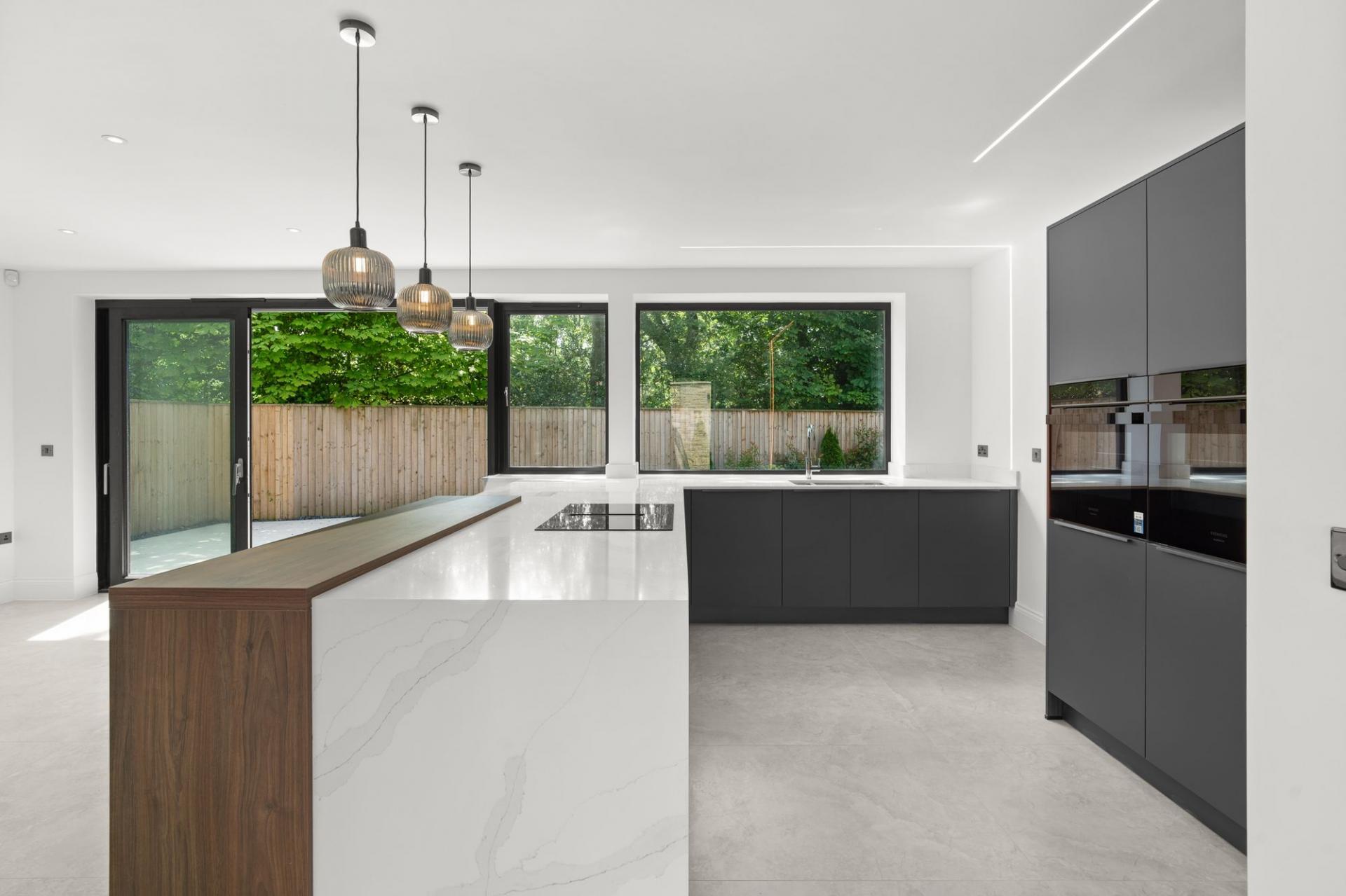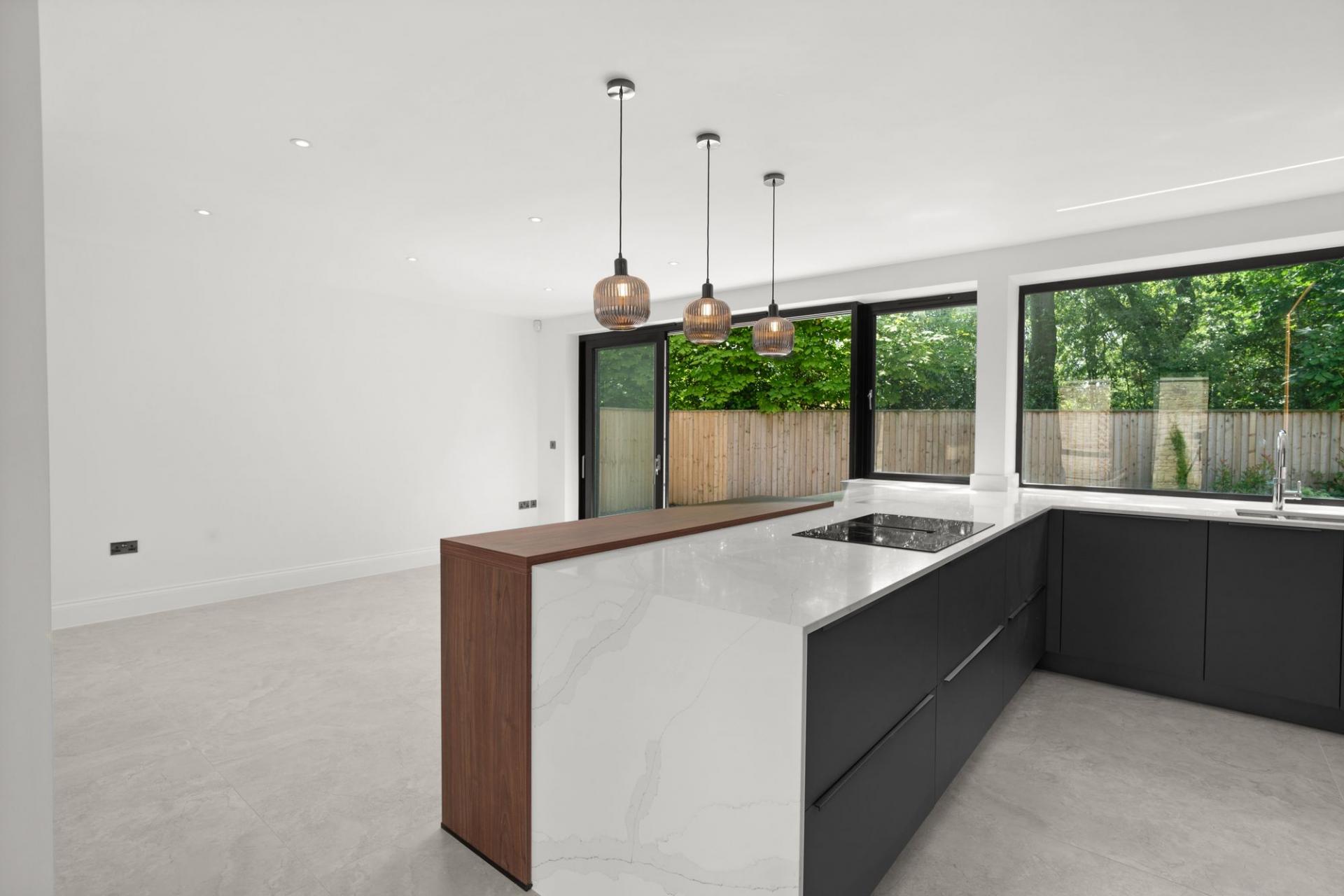 The heart of the home lies in the spectacular open-plan kitchen, dining and living space. Extending across the rear of the property, this carefully zoned area offers flexibility for family life and flows beautifully out to the garden via floor-to-ceiling aluminium-framed sliding doors.