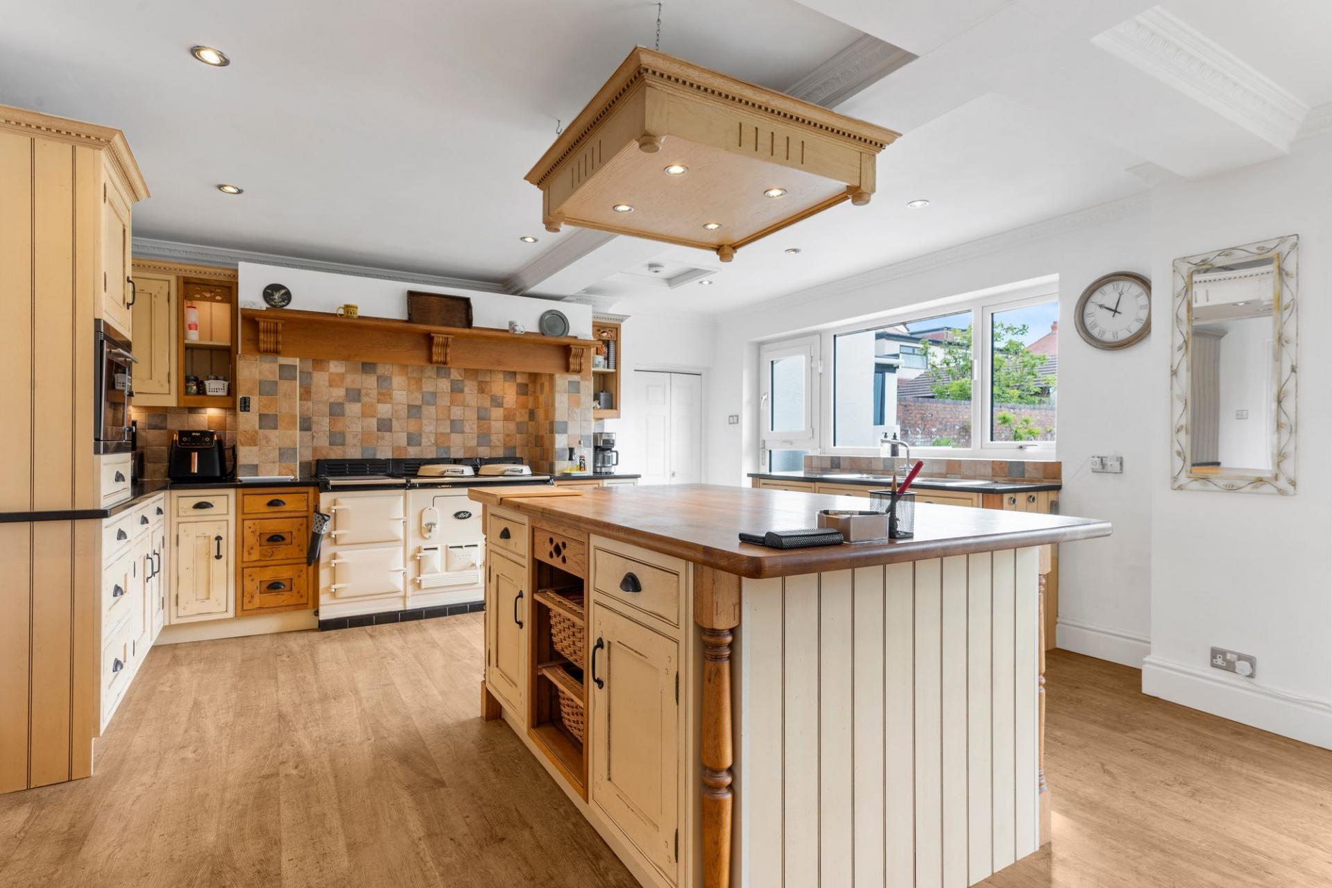 - Spacious farmhouse-style kitchen with large central island and garden access