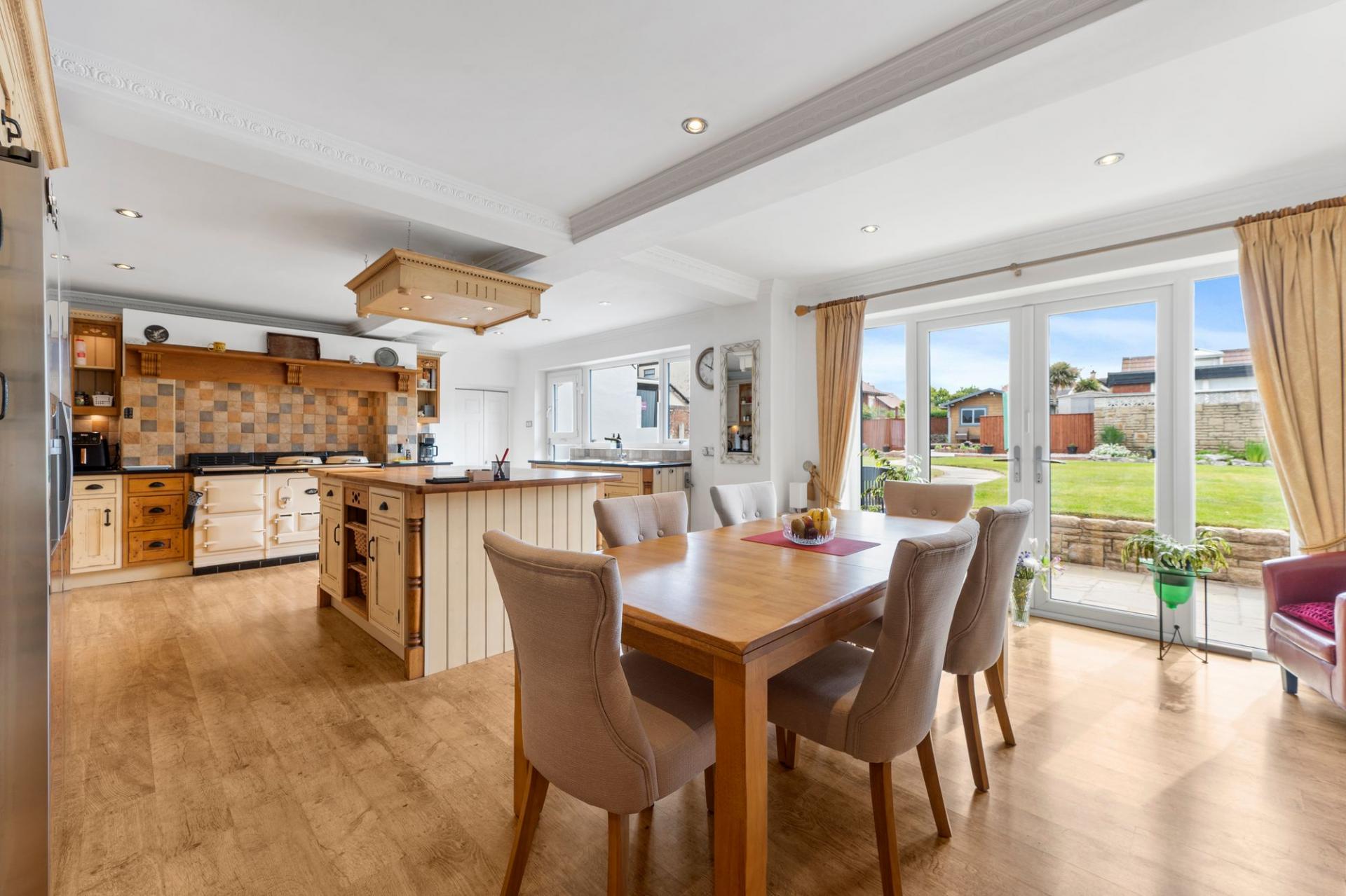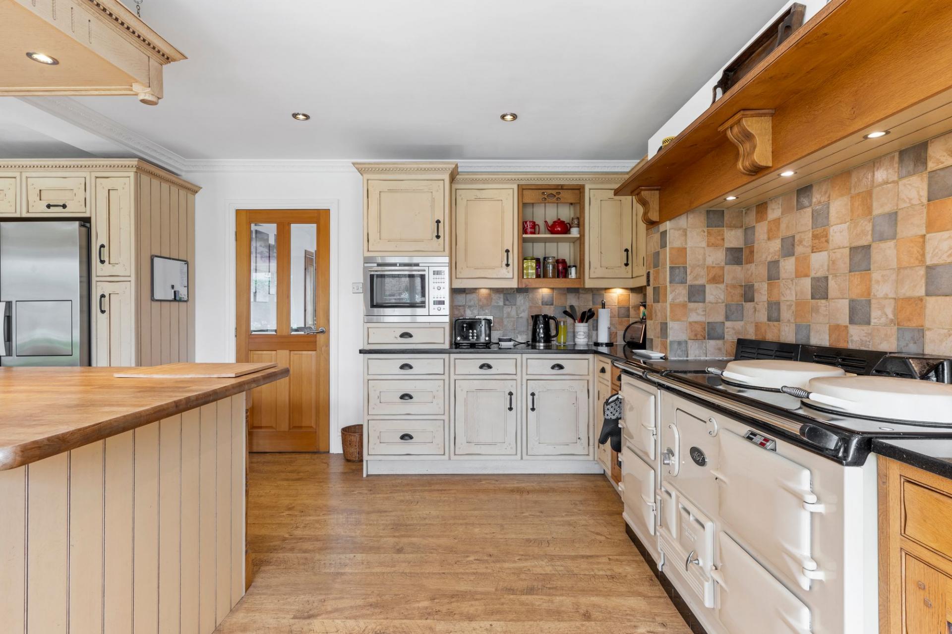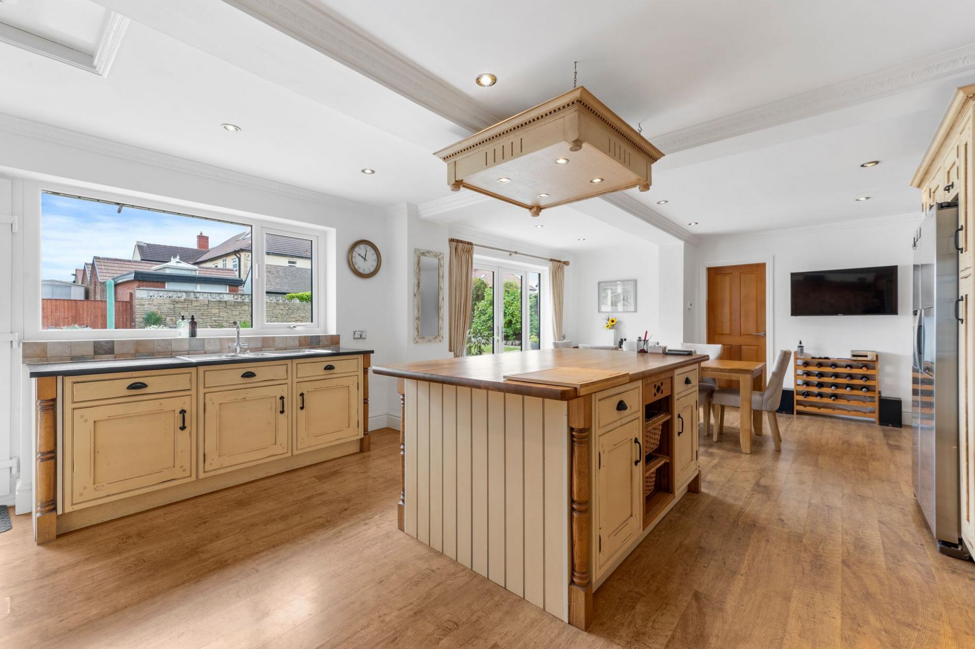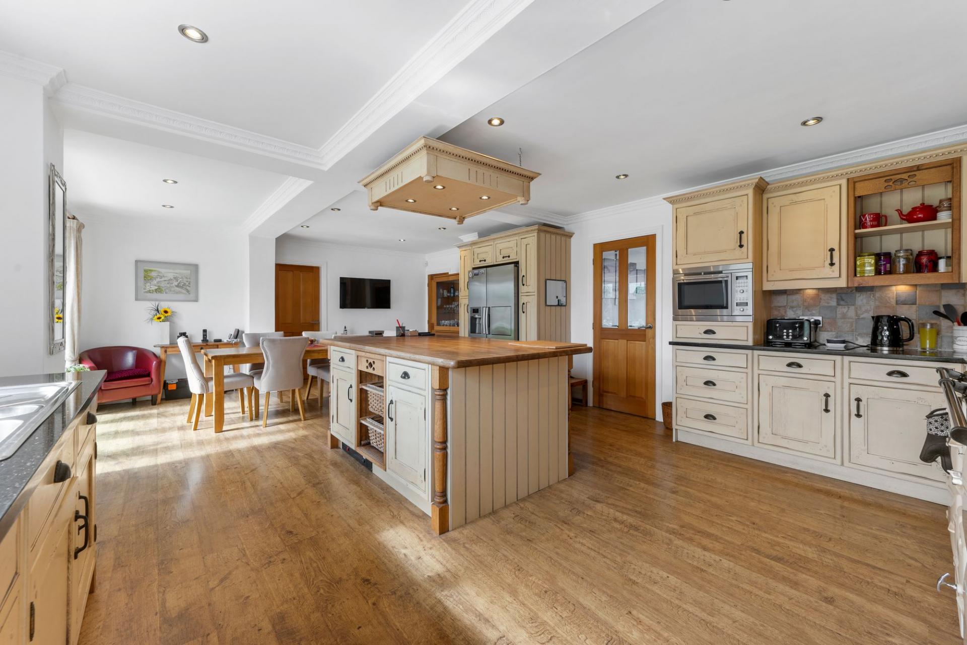 At the heart of the home lies a superb open-plan kitchen that blends farmhouse charm with family functionality. A large central island provides a sociable hub for cooking, chatting, or enjoying casual meals, while the surrounding cabinetry offers a timeless, country-style aesthetic. This space flows naturally into an informal family living or dining area, and full-height glazed doors open directly onto the rear garden — creating a seamless indoor-outdoor connection that's ideal in warmer months.