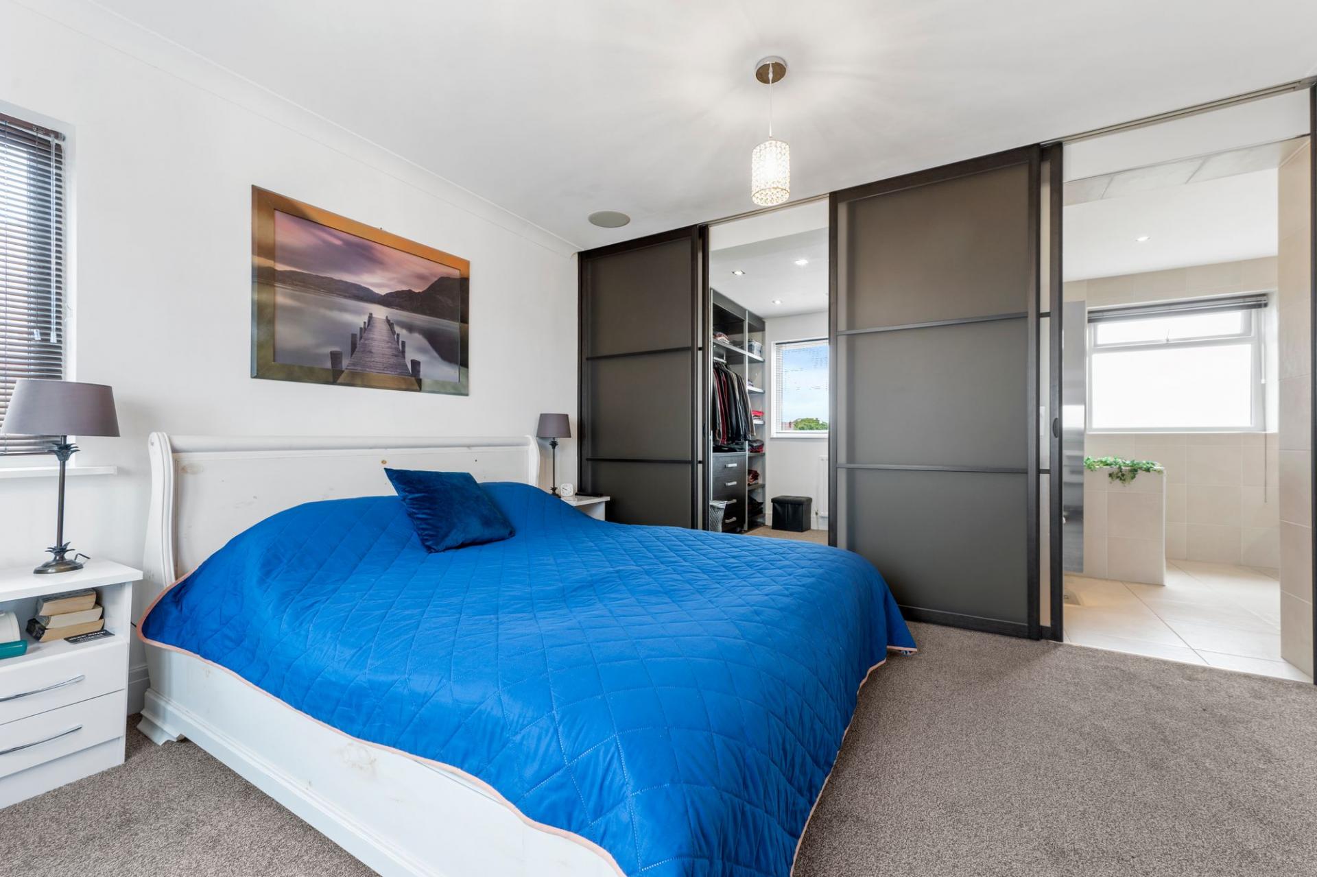 - Master bedroom with hidden walk-in wardrobe and ensuite behind sliding doors