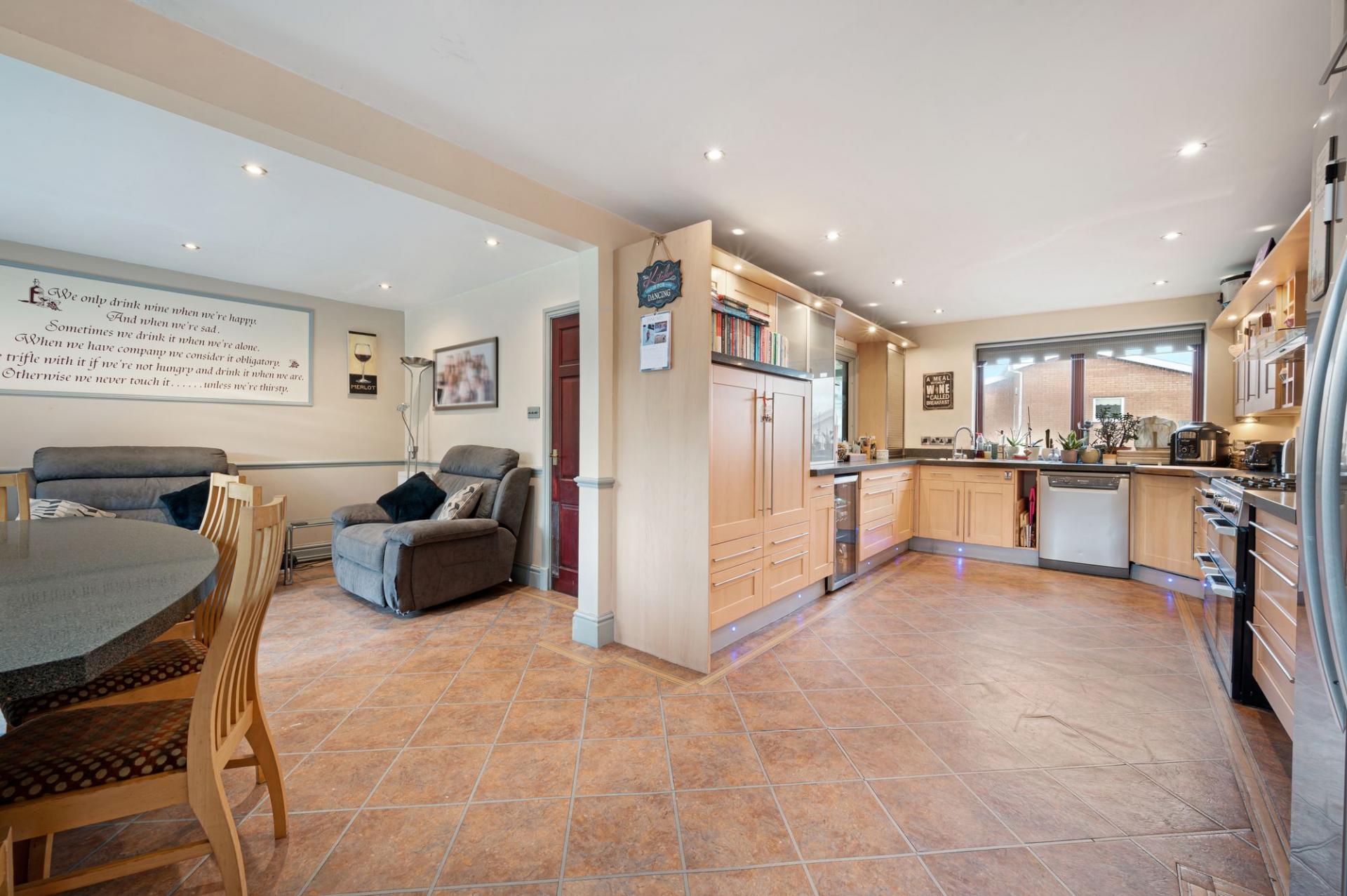 The heart of this home is the large open-plan family kitchen with a range of fitted wall and base units offering ample storage space. The kitchen seamlessly flows into a dining area, creating a perfect setting for family meals and gatherings. A utility room off the kitchen adds convenience and practicality to daily tasks.